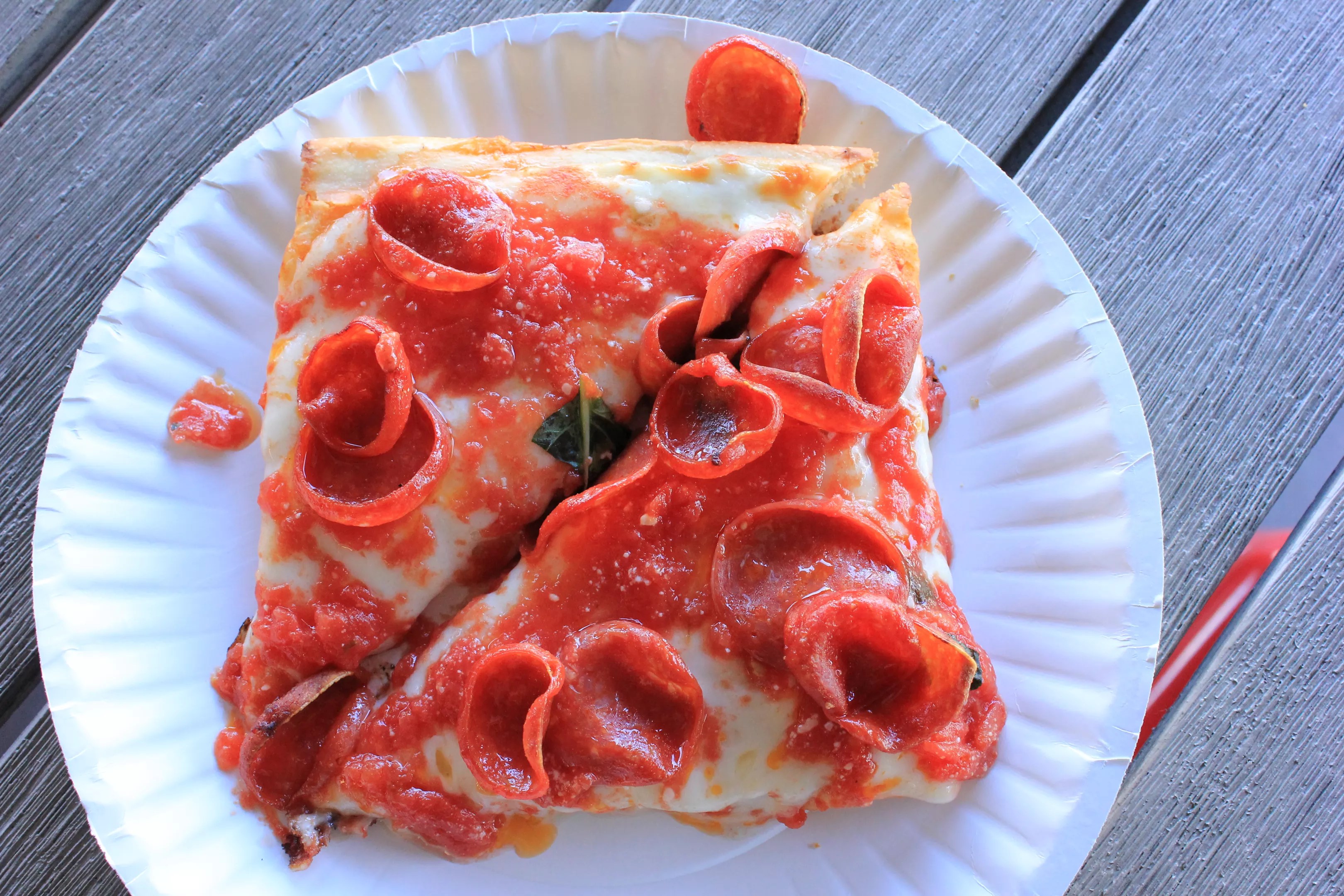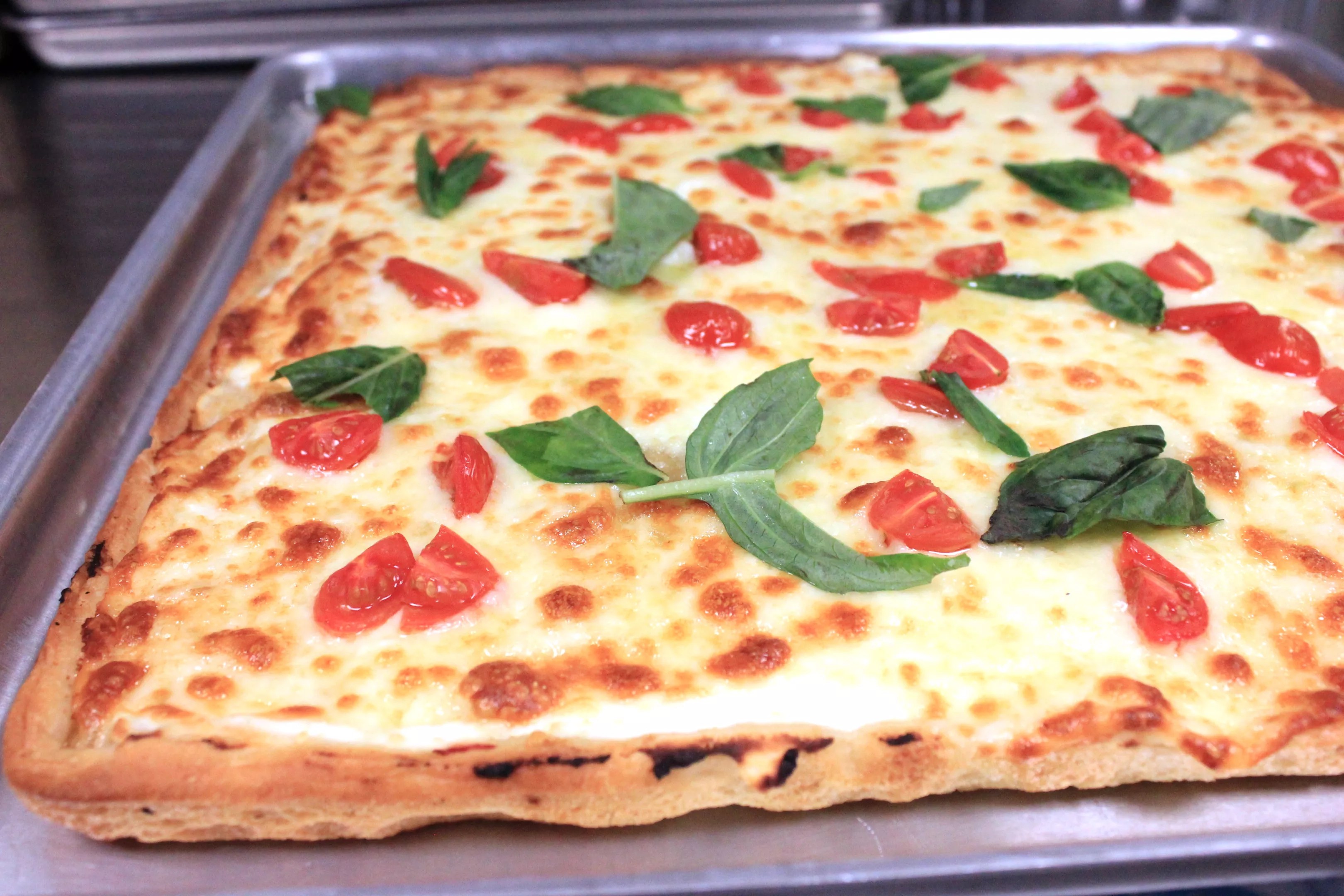 His standard grandma-style pie comes topped with torn basil. Though thick and crunchy on the bottom, the pizza has surprising lightness. It’s Neapolitan in spirit, somehow: Neapolitan in a thick-crust vessel. We’re in oxymoronic territory here, that of spherical cubes and jumbo shrimp. Langu’s squares have more finesse than you find in your typical heady, gooey, thick-crusted pie.