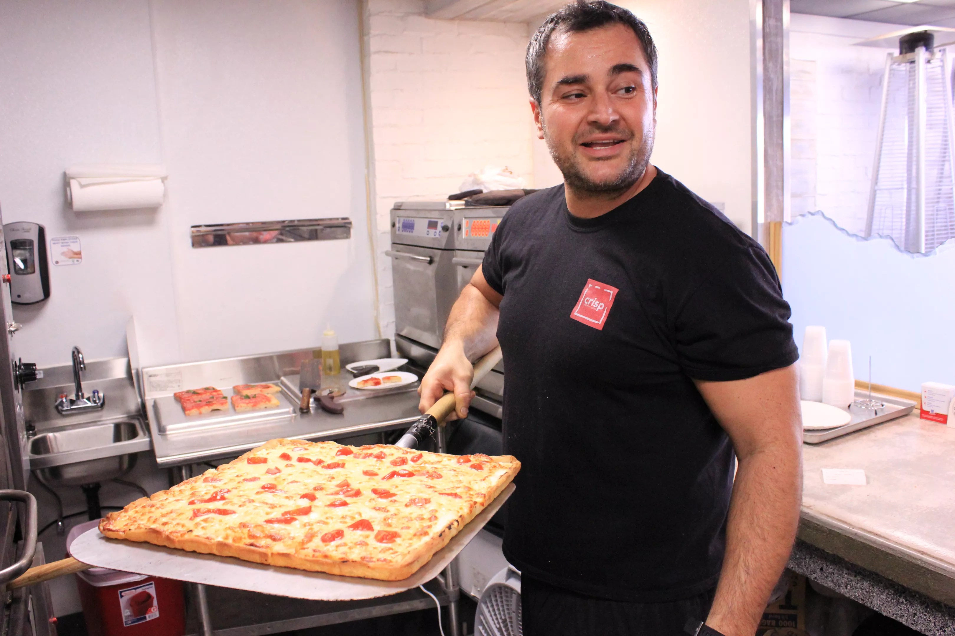 His 16-by-16-inch pies contain 12 slices; they’re so light you practically inhale bites. The thin crisp layer on the very bottom of the crust, created by oiling the pan, seems to soften the airy strata above by contrast.
