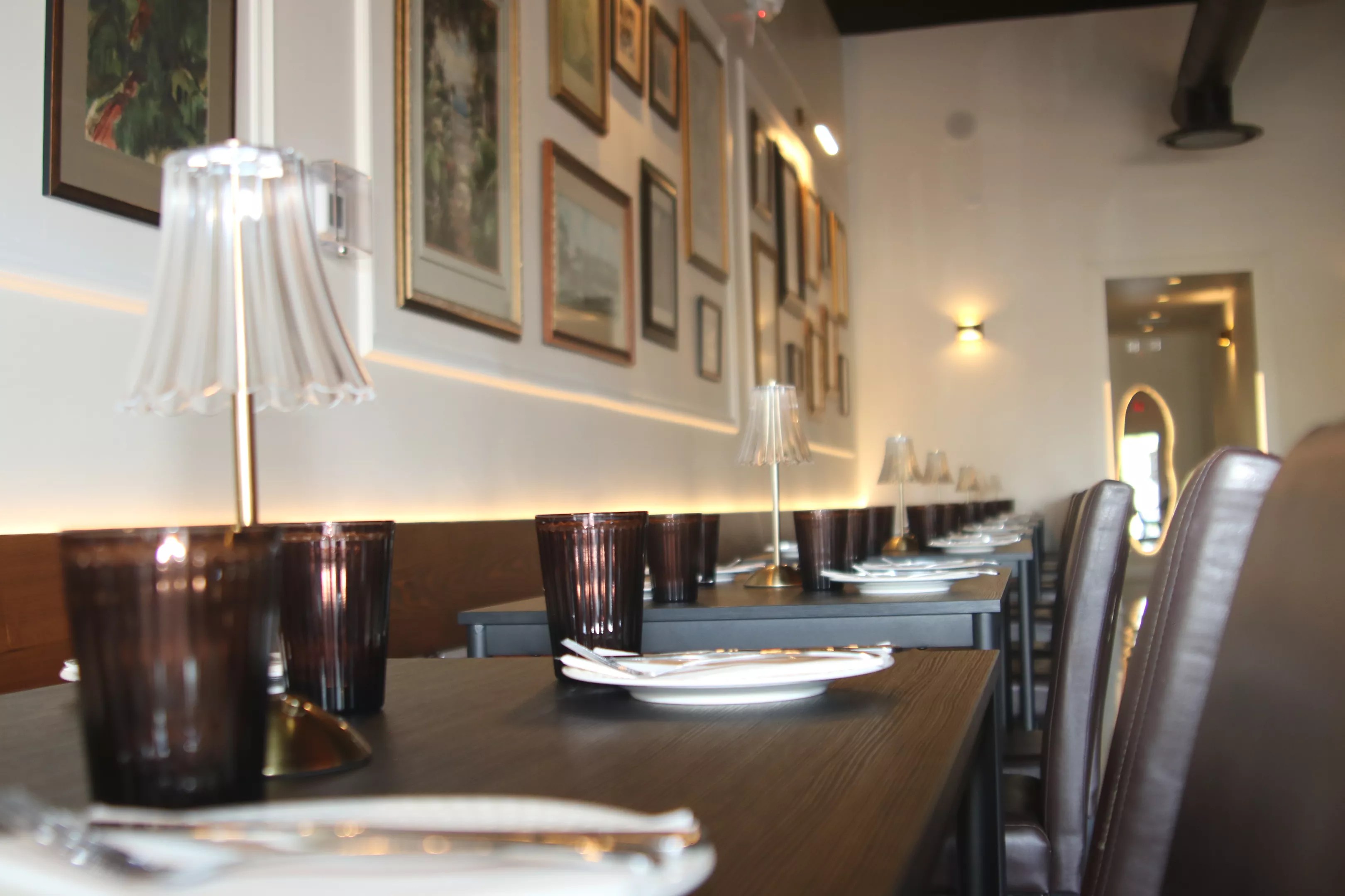 The 2,000-square-foot restaurant’s aesthetics were paid just as much attention as the pasta dishes. Vintage artwork and brass fixtures adorn the walls. An elongated bench seat extends the length of the restaurant and seats diners at sleek modern tables. A wooden bar brings warmth to the space.