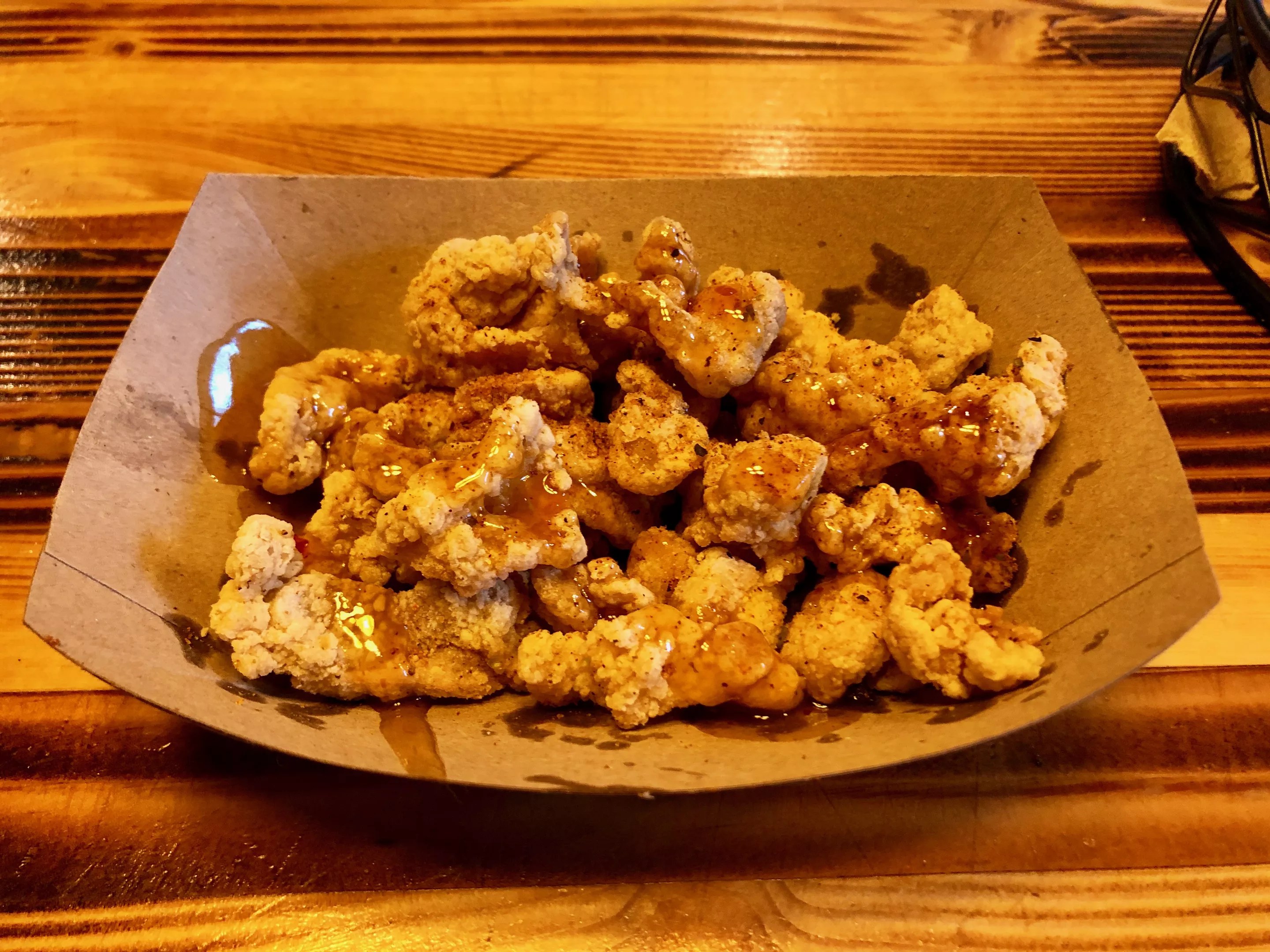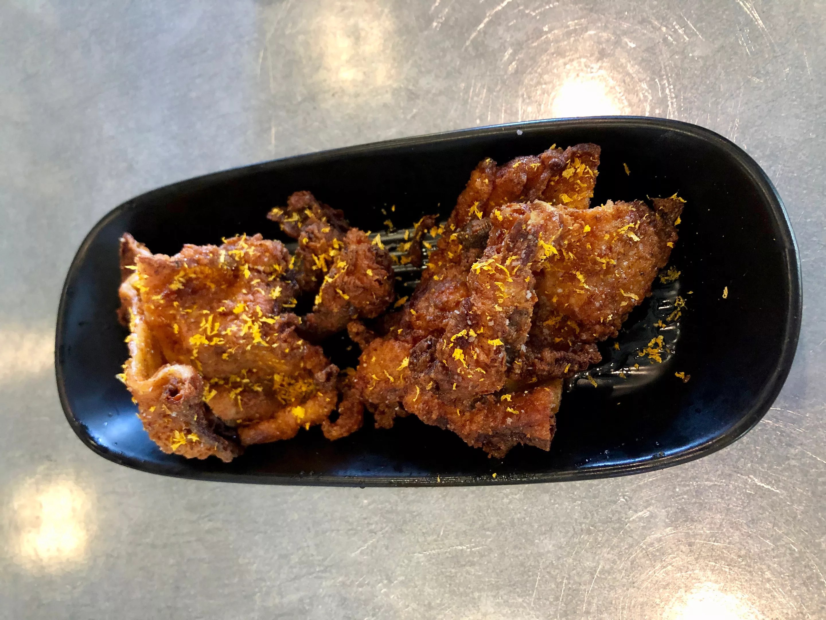 This Roosevelt Row joint is a shrine to barbecue. Aggressive flavors are piled on by proprietor Phil “the Grill” Johnson. As good as Johnson is with brisket, he rules with chicken too (we love you, Philly Crack wings). The chicken skins at Trapp Haus BBQ are little bite-size crumbles of crunchy, seasoned skins. The paper tray is perfectly drizzled with honied hot sauce, a sweet offsetting of the saltiness. Chicken skins can arrive alone, as described, or upon the Philly Phil special – smoked brisket, hot links, and those crispy chicken skins with honey hot barbecue sauce on a toasted brioche bun.