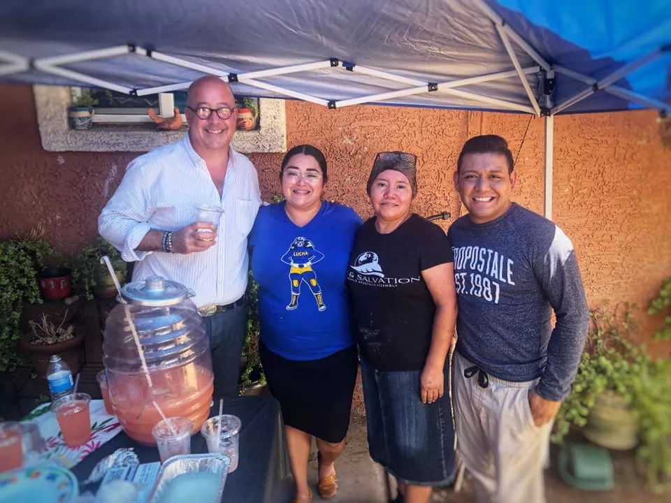 From left, Andrew Zimmern, Abril Gallardo, Sandra Felicidad Cervera Gallardo, and Raul Gallardo Jr. take a break during filming an episode of What’s Eating America.