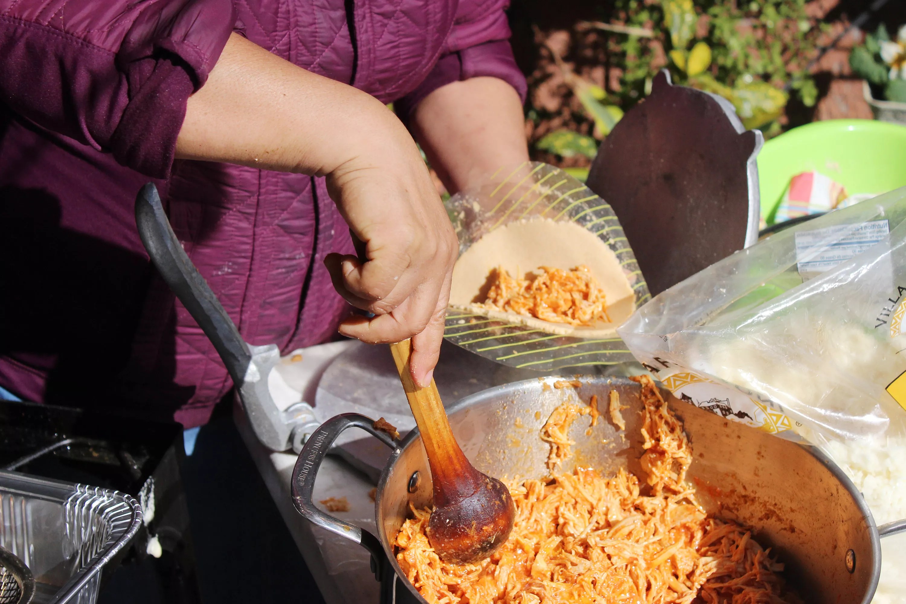 Sandra Felicidad Cervera Gallardo fills a tortilla with tinga before she slips it into the oil.