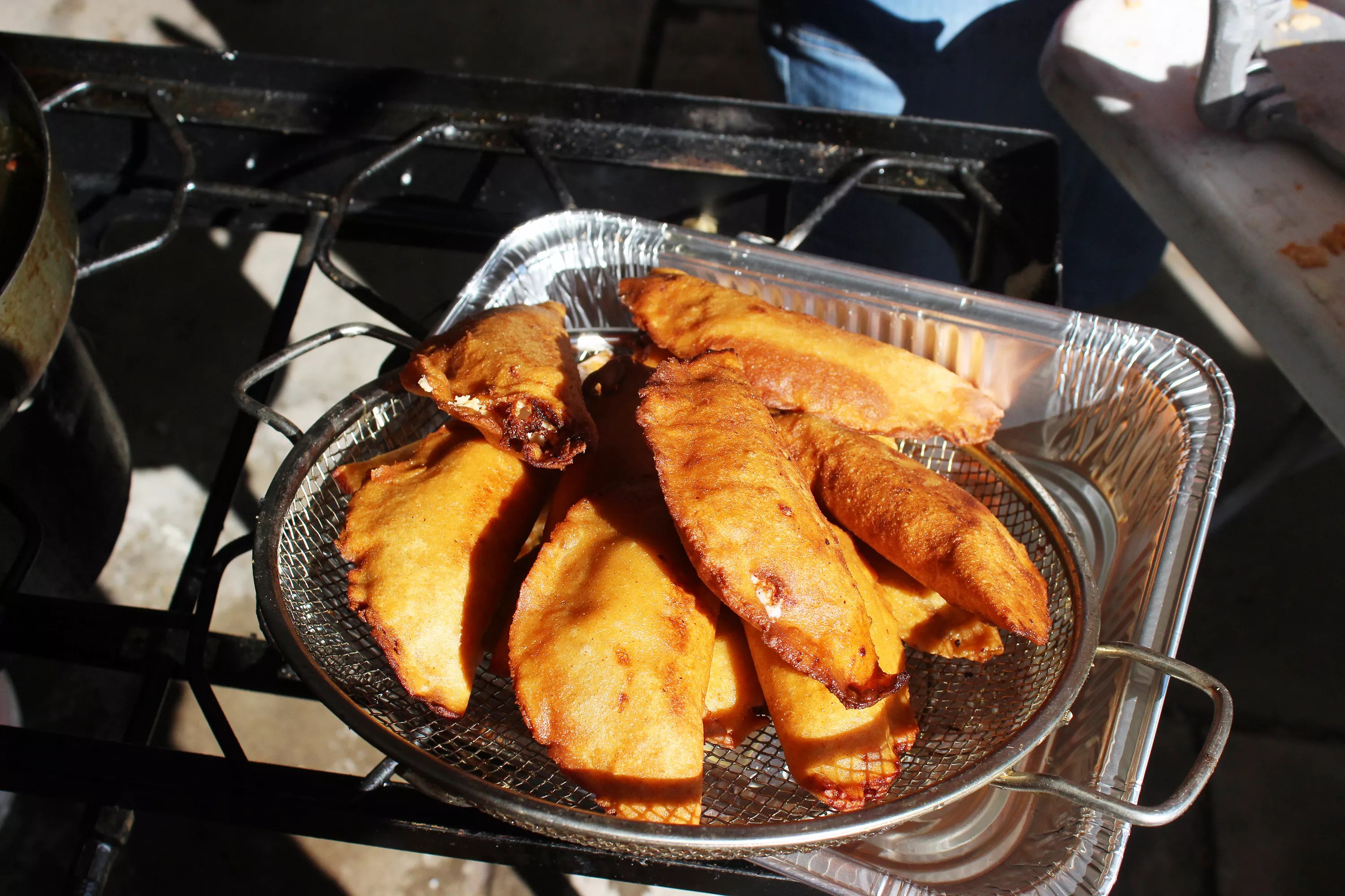 A basketful of chicken tinga quesadillas cool off after being fried in oil.