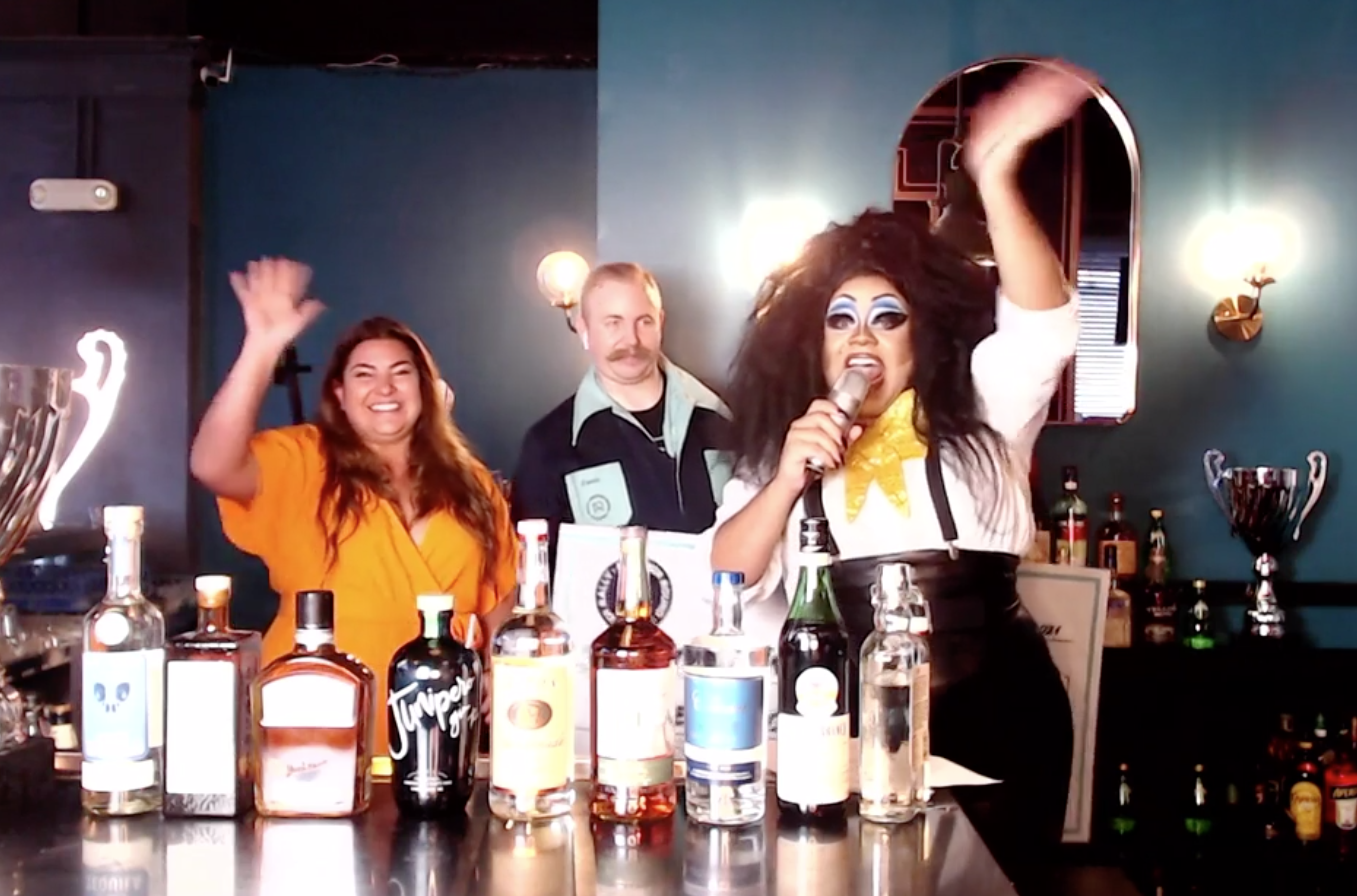 Another Round Another Rally, led by cofounders Amanda Gunderson (left) and Travis Nass (center), has provided support to hospitality workers through education and fundraising, including the virtual cocktail competition, "Ready, Set, Show!", hosted by drag queen Meatball (right).