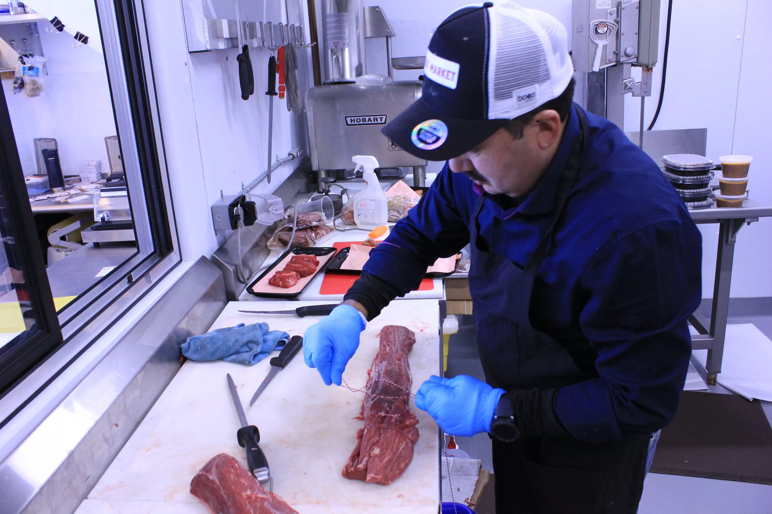 His hat reads “Meat Market.” He’s the butcher.