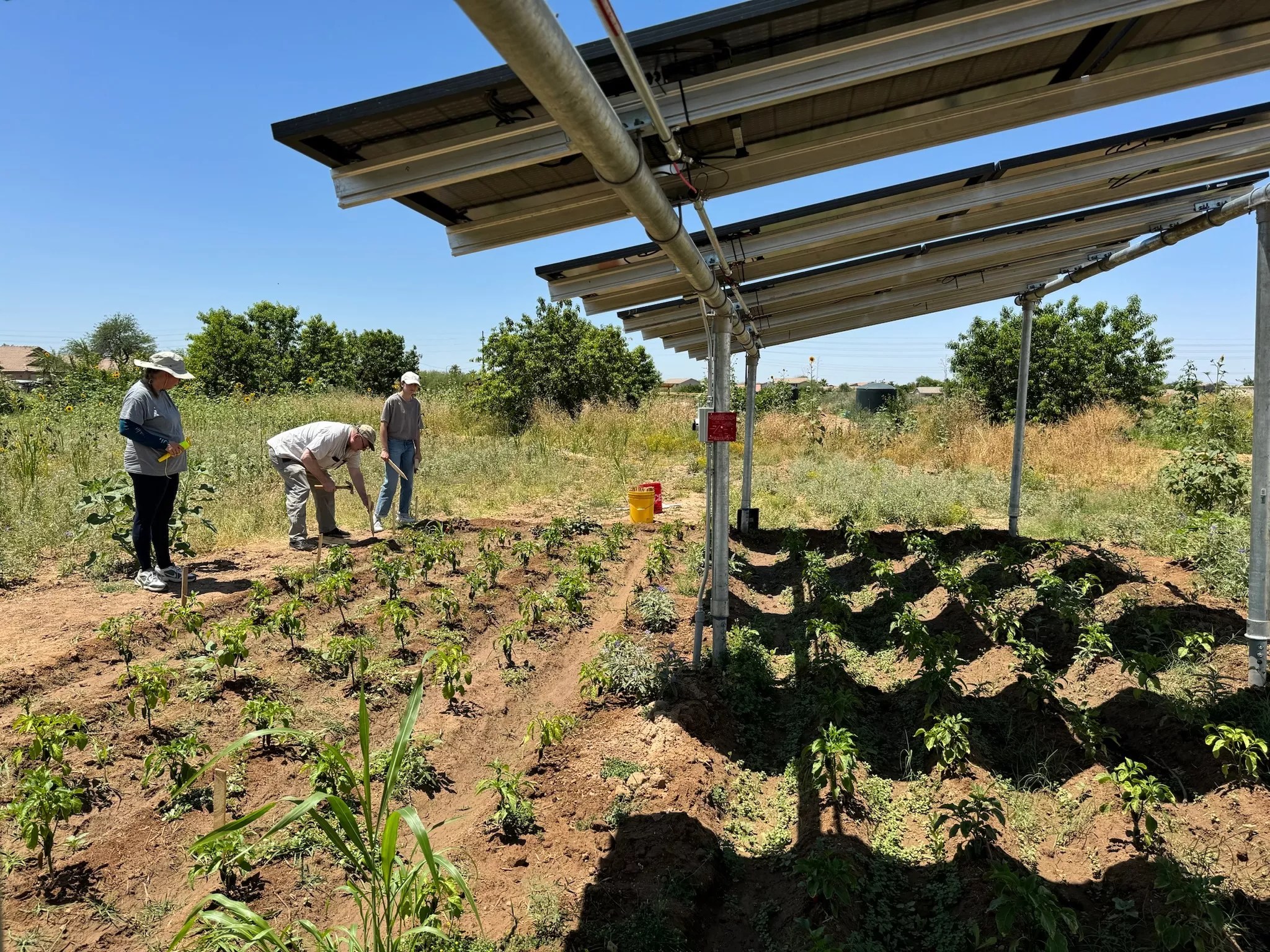 The nonprofit organization Growing Green built an agrivoltaic plot on Spaces of Opportunity, a 19-acre community farm in Phoenix.