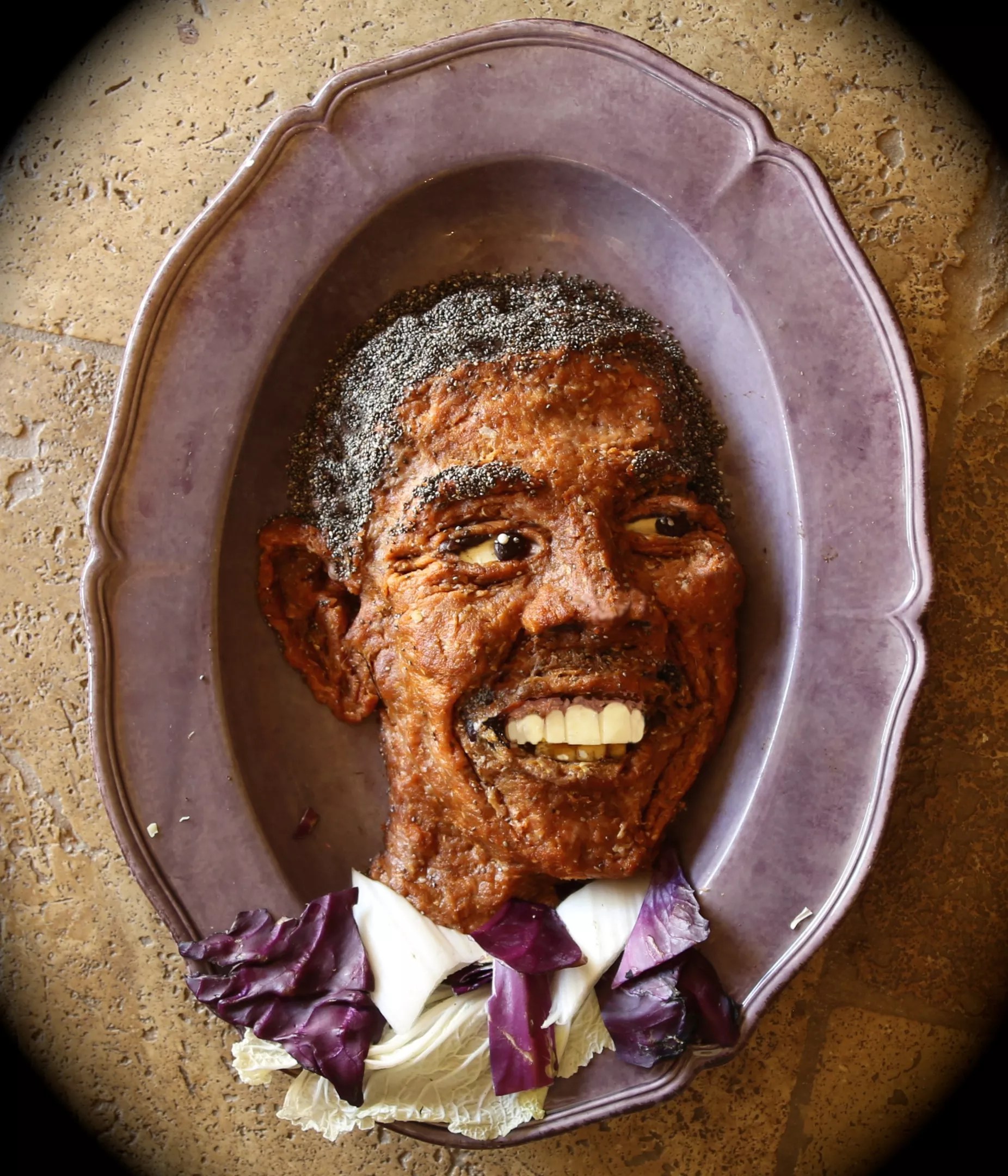 The Obama – a politician portrait consisting of bread, refried beans, and meatloaf.