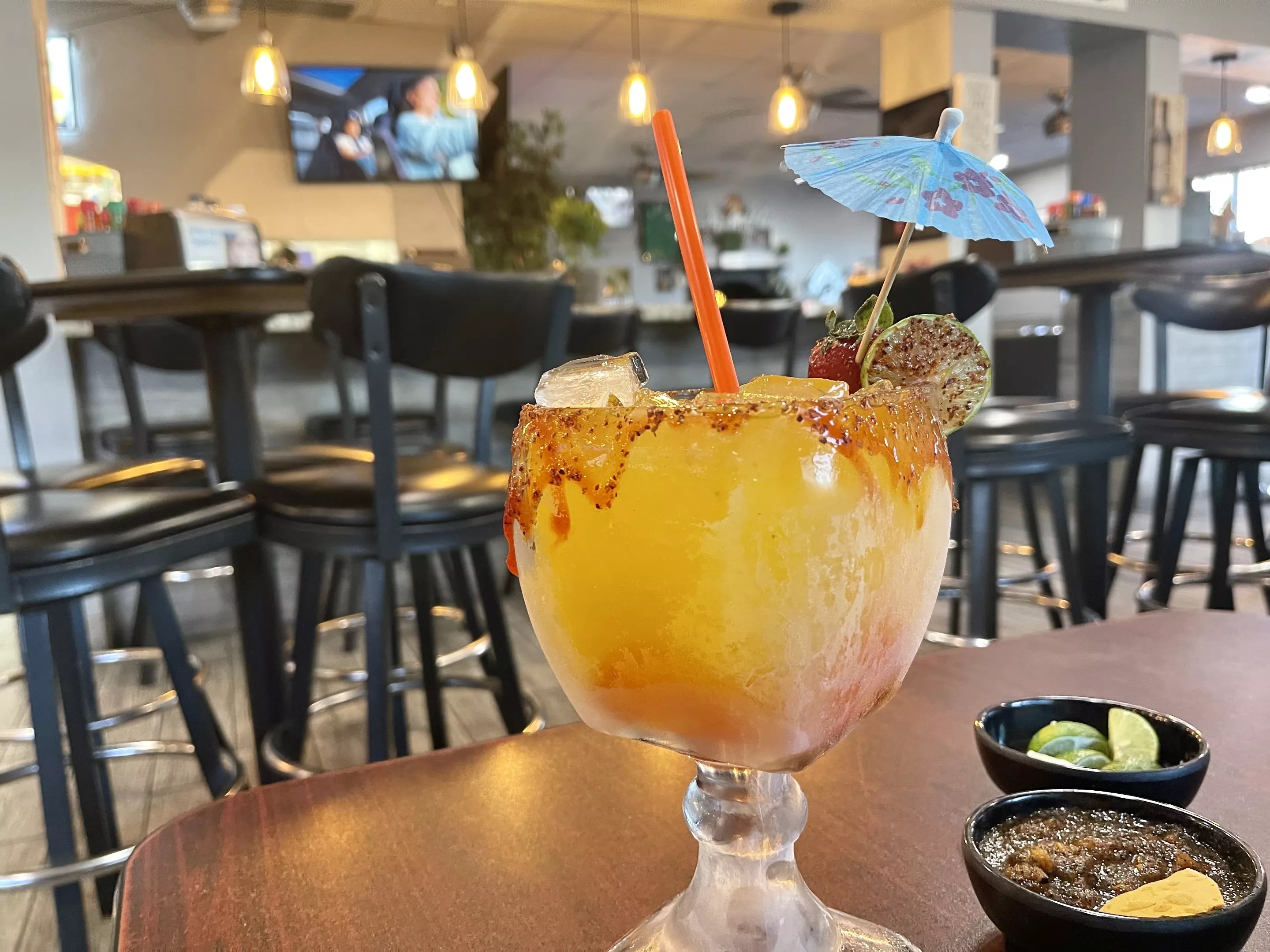 The mango margarita at Mariscos Ensenada is sweet and refreshing, punctuated by salty and savory hints of chamoy from the rim.