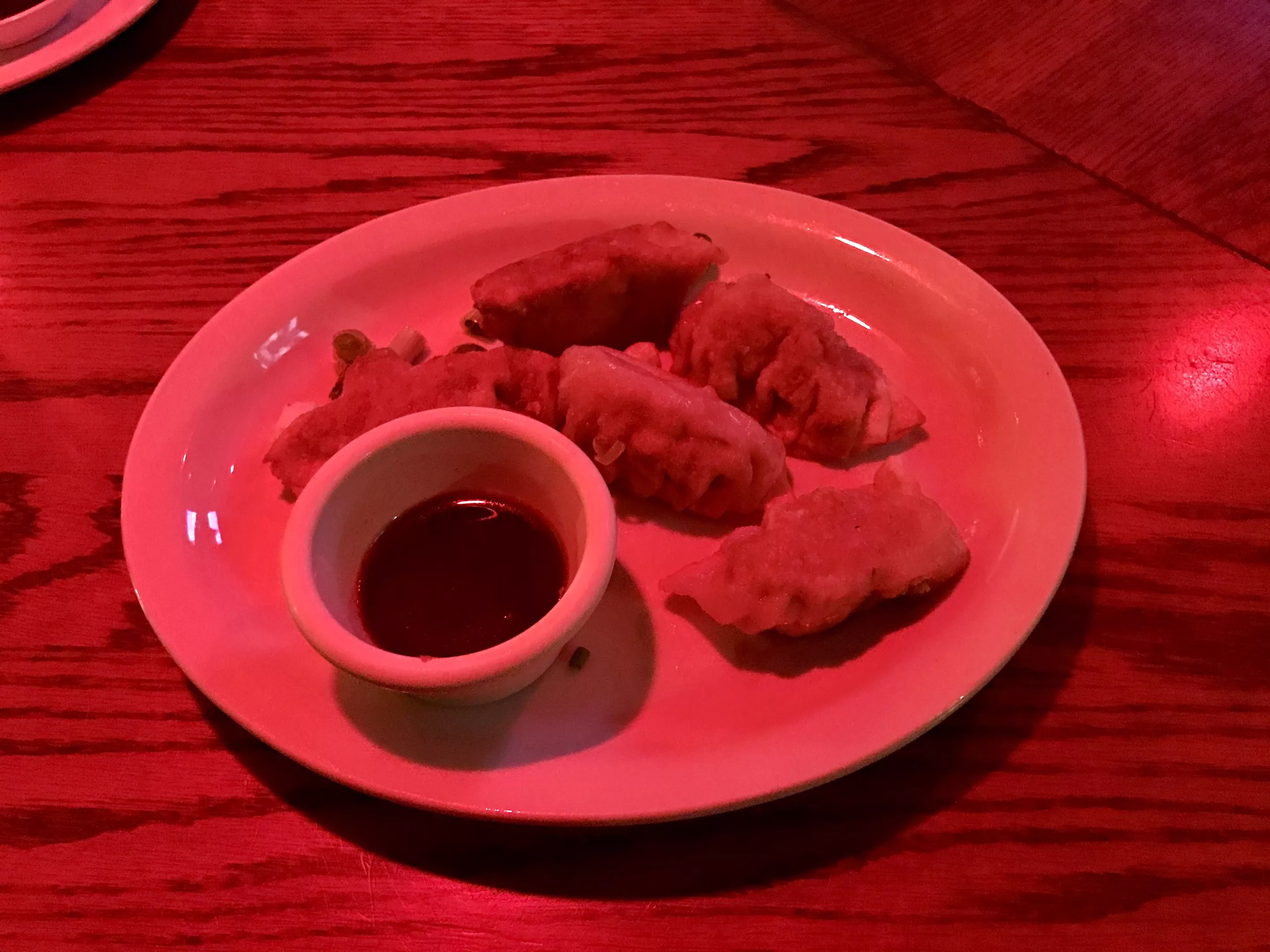 The Interior: Autumn Court is colorful, in more ways than one. The light bulbs around the bar have been switched out for red ones, while the glittering golds and deep reds of Chinese kitsch speckle the walls. The odd little building feels like a Swiss chalet, with rock walls and sloping wood beams, while the bartender’s Hawaiian shirt and the red lights will have you ordering a Singapore Sling and humming “Roxanne.” The overall effect is disorienting, no pun intended. Potstickers at Autumn Court, where the presentation leaves something to be desired. Melissa Campana