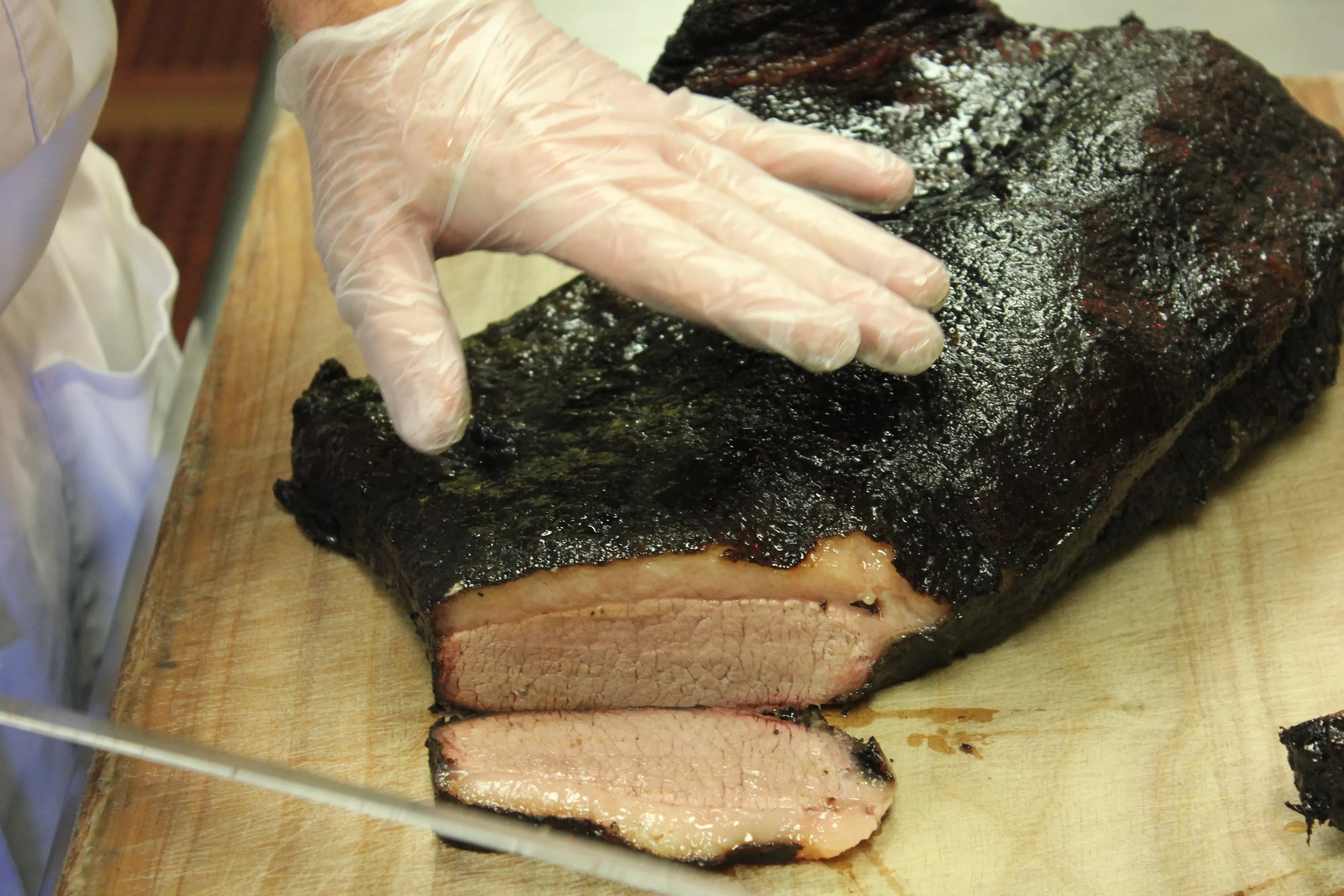 Slicing against the grain to free a strip of lean(ish) brisket.