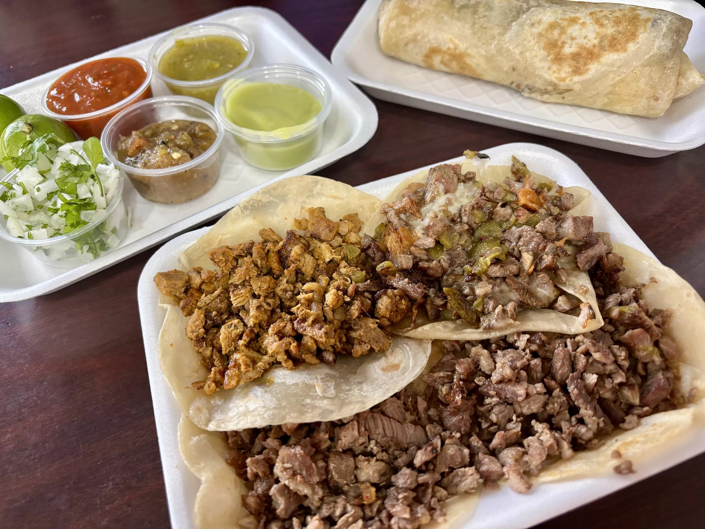 Multiple locations Tacos Chiwas began in a repurposed Dairy Queen, complete with a drive-thru window. Since that original location, the chain has expanded and the current locations are a little more elevated. But the $3.49 tacos and $5 gorditas are a constant that keeps customers coming back. Fill them with juicy al pastor, cheesy rajas or spicy deshebrada roja or verde. Jackfruit quesabirria tacos at Tacos Veganos are juicy and rich, just like their meat counterparts. Dominic Armato