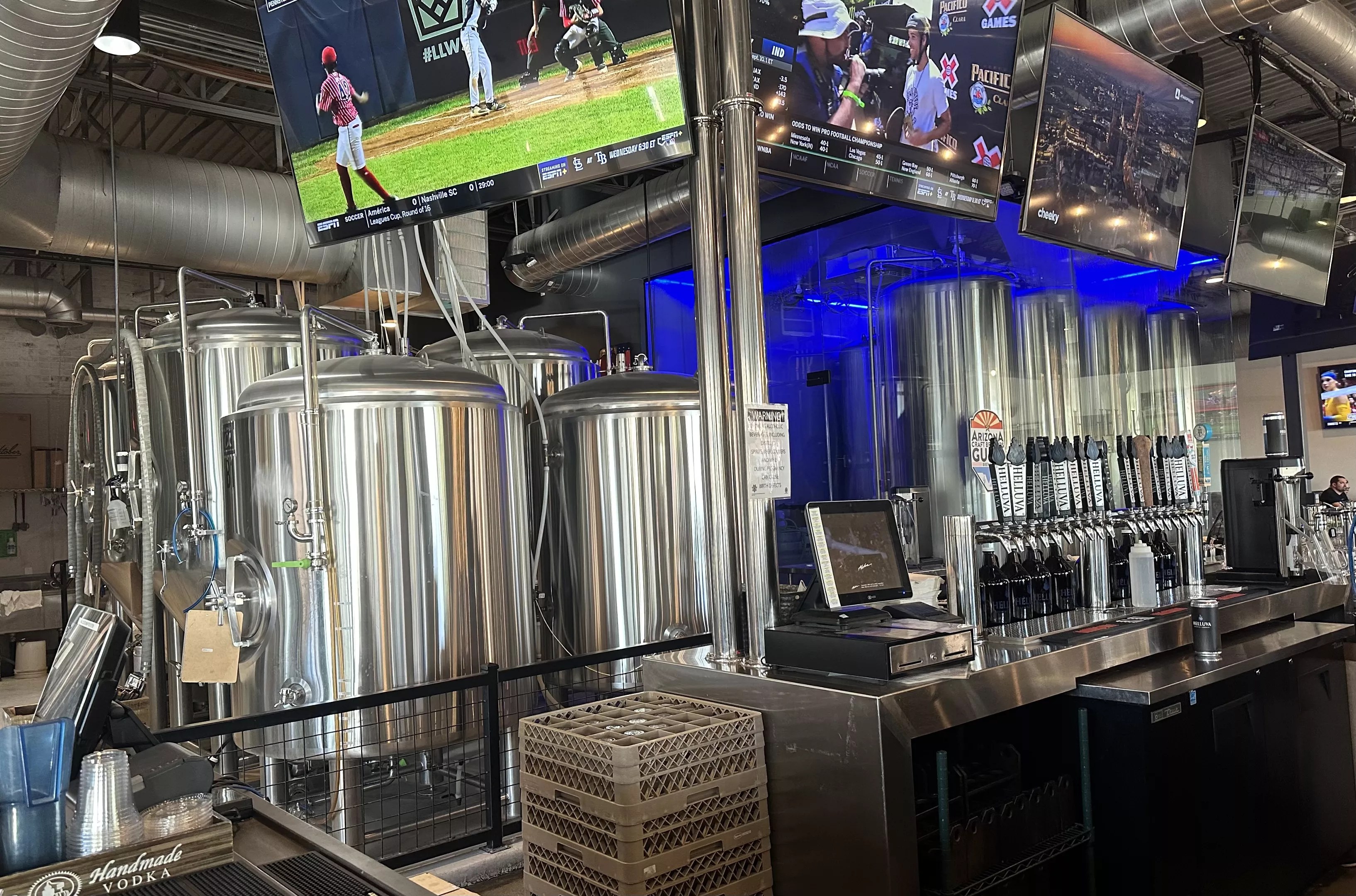 Helluva Brewing Co.’s brewing tanks situated behind the bar proudly display where the house beers come to life.