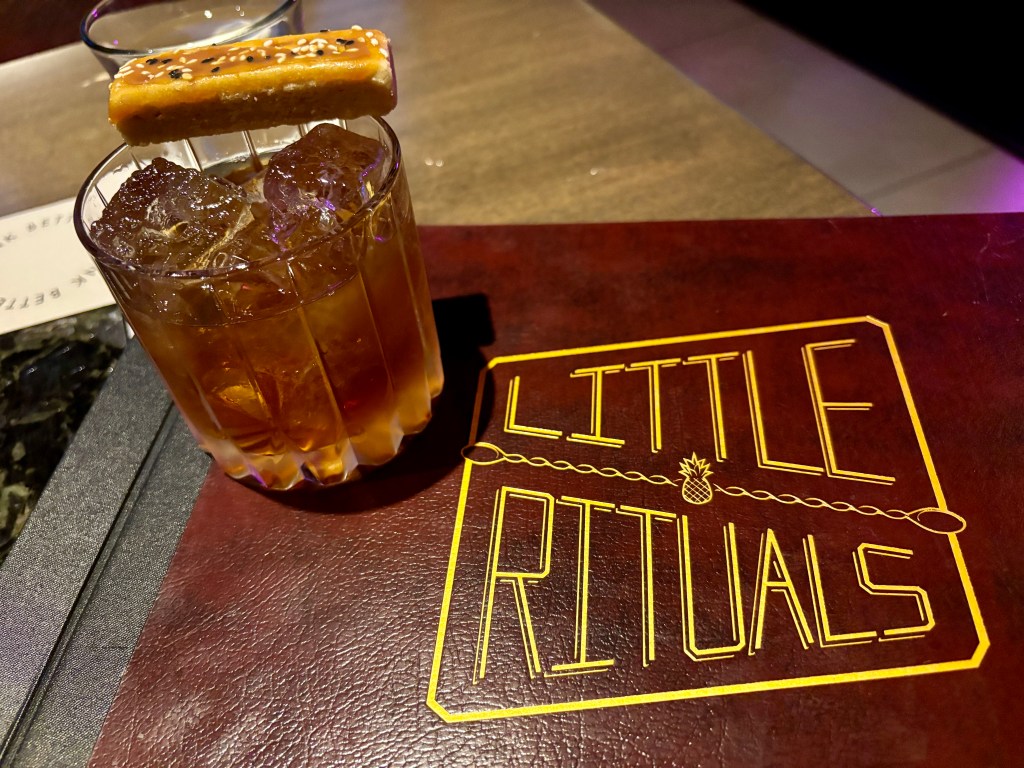 Described on the novel-like menu as “buttery, rich, decadent, smooth,” the New Jack City at Little Rituals is all of those things and more. Served in a rocks glass with an oblong shortbread cookie topped with sticky, sweet caramel and white and black sesame seeds, this treat is dessert in a glass. Start with a bite of the buttery shortbread before swooning over a sip of the whiskey-based tipple. In total, the drink includes Jack Daniel’s triple mash whiskey, brown butter, cardamaro, Oloroso sherry, Meletti amaro and salted black sesame bitters. It’s rich, with a perfect balance of bitter and sweet, and is the ideal treat for a chilly fall or winter evening.