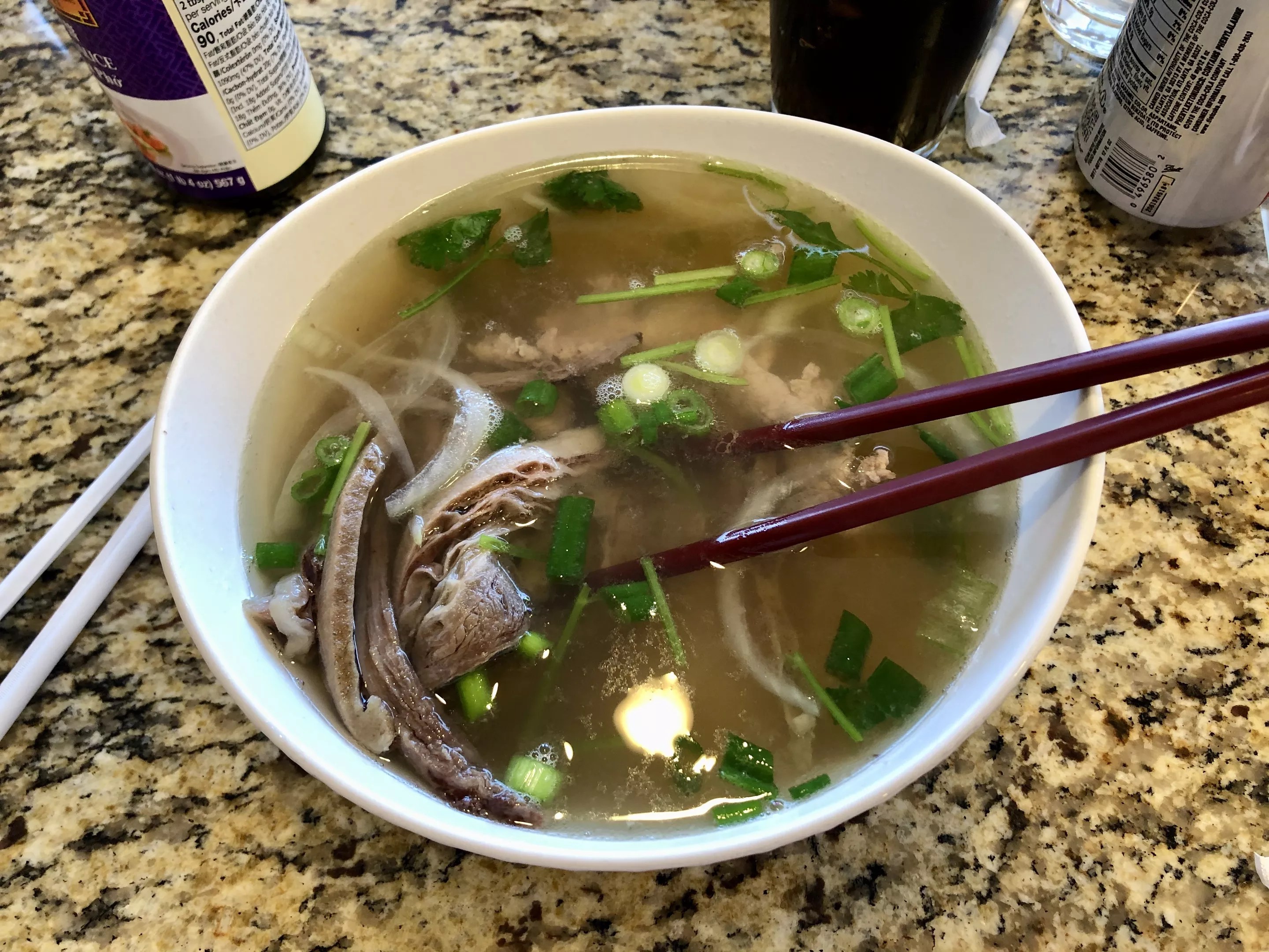 Tucked away in a large shopping complex, Pho Chandler is a small restaurant slinging bowls of pho filled with notably fresh ingredients and friendly service. Though it offers a rather small bowl of pho (at least in comparison to the other spots on the list), it doesn’t skimp on ingredients. The soup is overloaded with the standard ingredients of carrots, bok choy, onions, broccoli, and cabbage – which is further accompanied by a big plate of bean sprouts, basil, and jalapenos. A bowl with full flavors makes us quickly forget the size and eat up all the tasty beef and veggie soup.