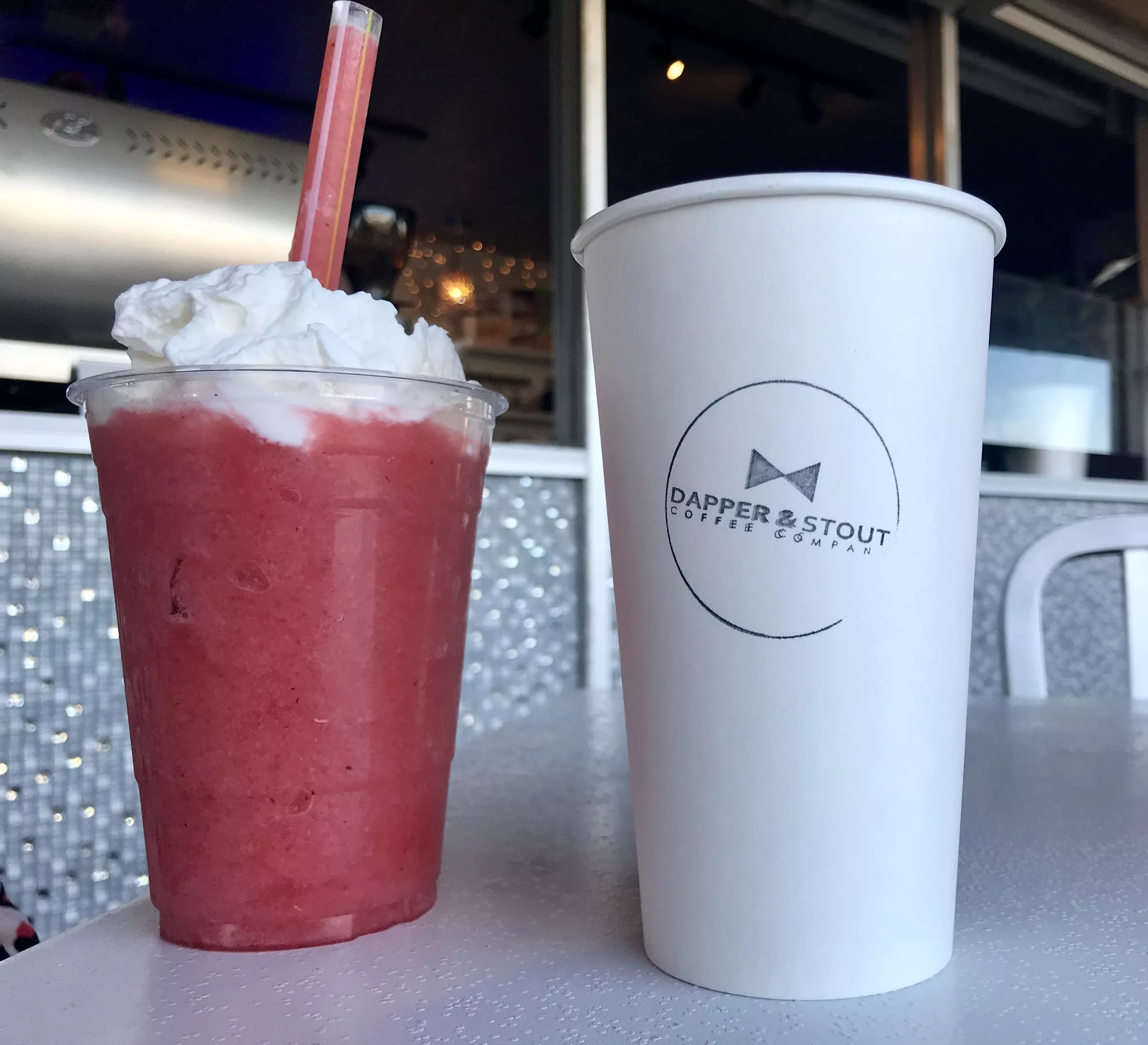 A strawberry smoothie and Dapper & Stout’s fresh brewed coffee (roasted locally).