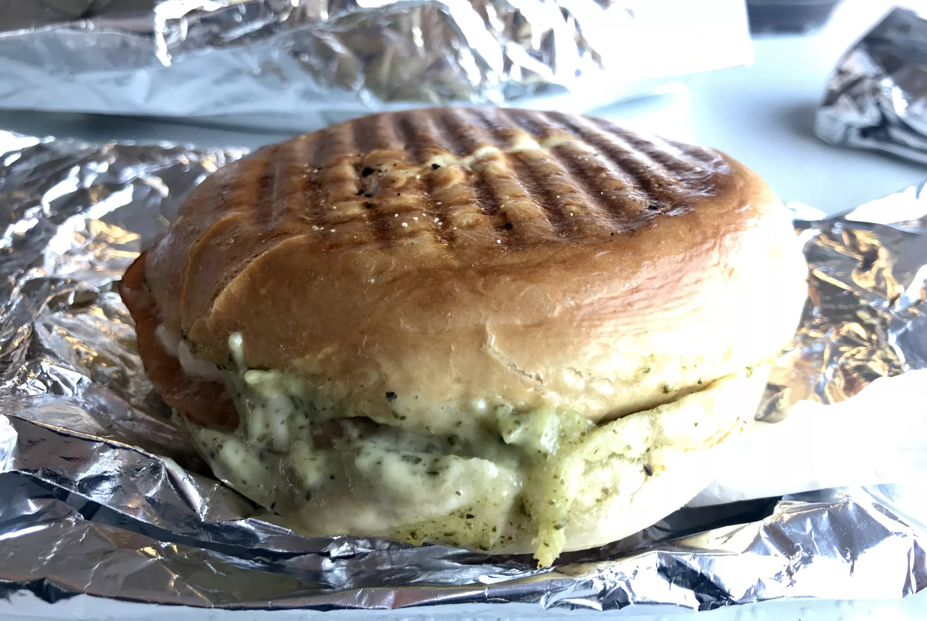 The breakfast bagel at D&S: scrambled eggs, roasted peppers, mozzarella and pesto mayo, all wrapped to-go. Might be time to rethink that drive-thru on your way to work.