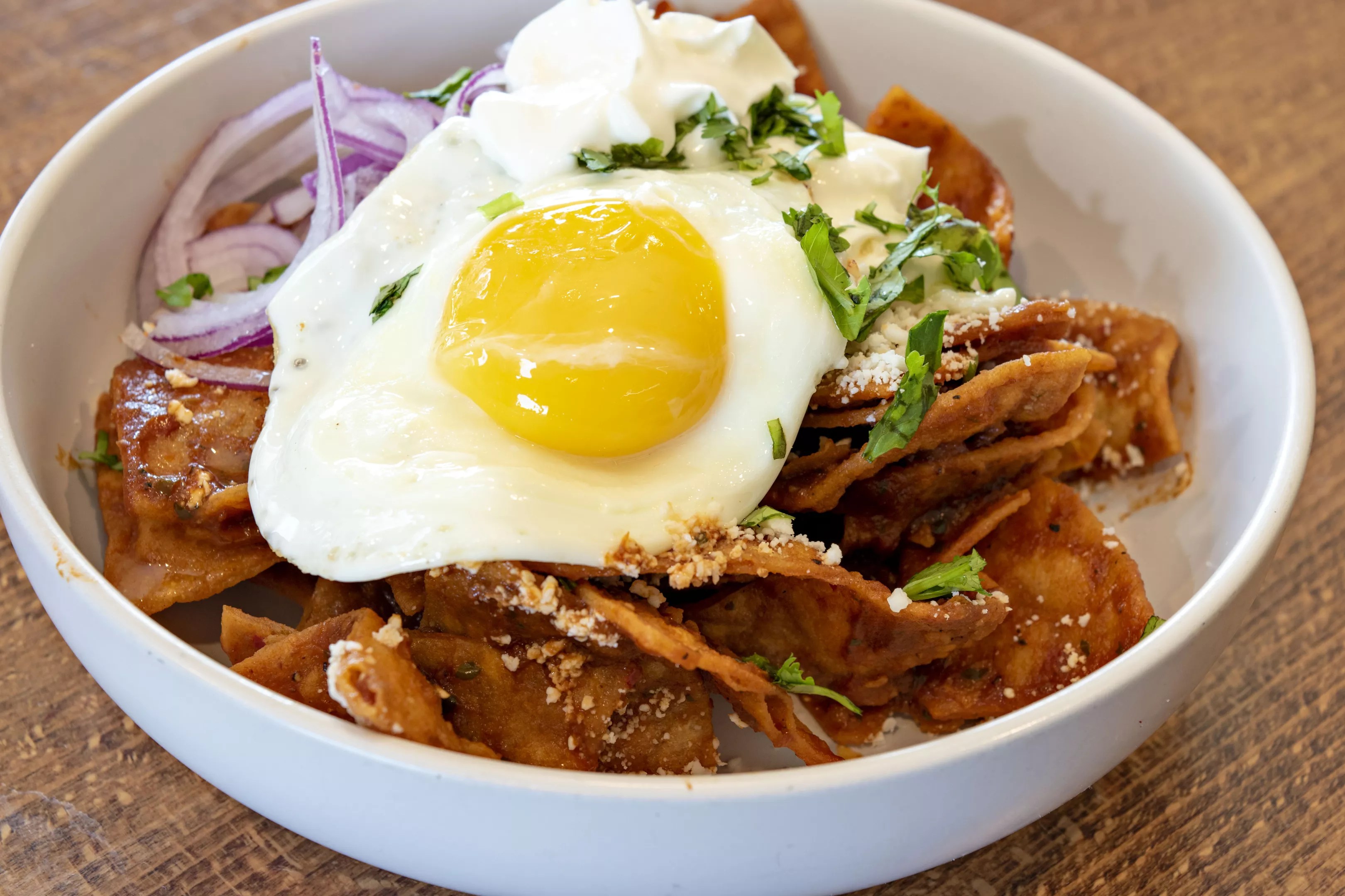 This local breakfast and brunch chain knows how to put together a plate of chilaquiles. At Over Easy, the chilaquiles dish consists of corn tortilla chips loaded with chicken, two eggs, cheddar cheese, ranchero sauce, pico de gallo, sour cream, and green onion. And the order is gluten-free to boot.