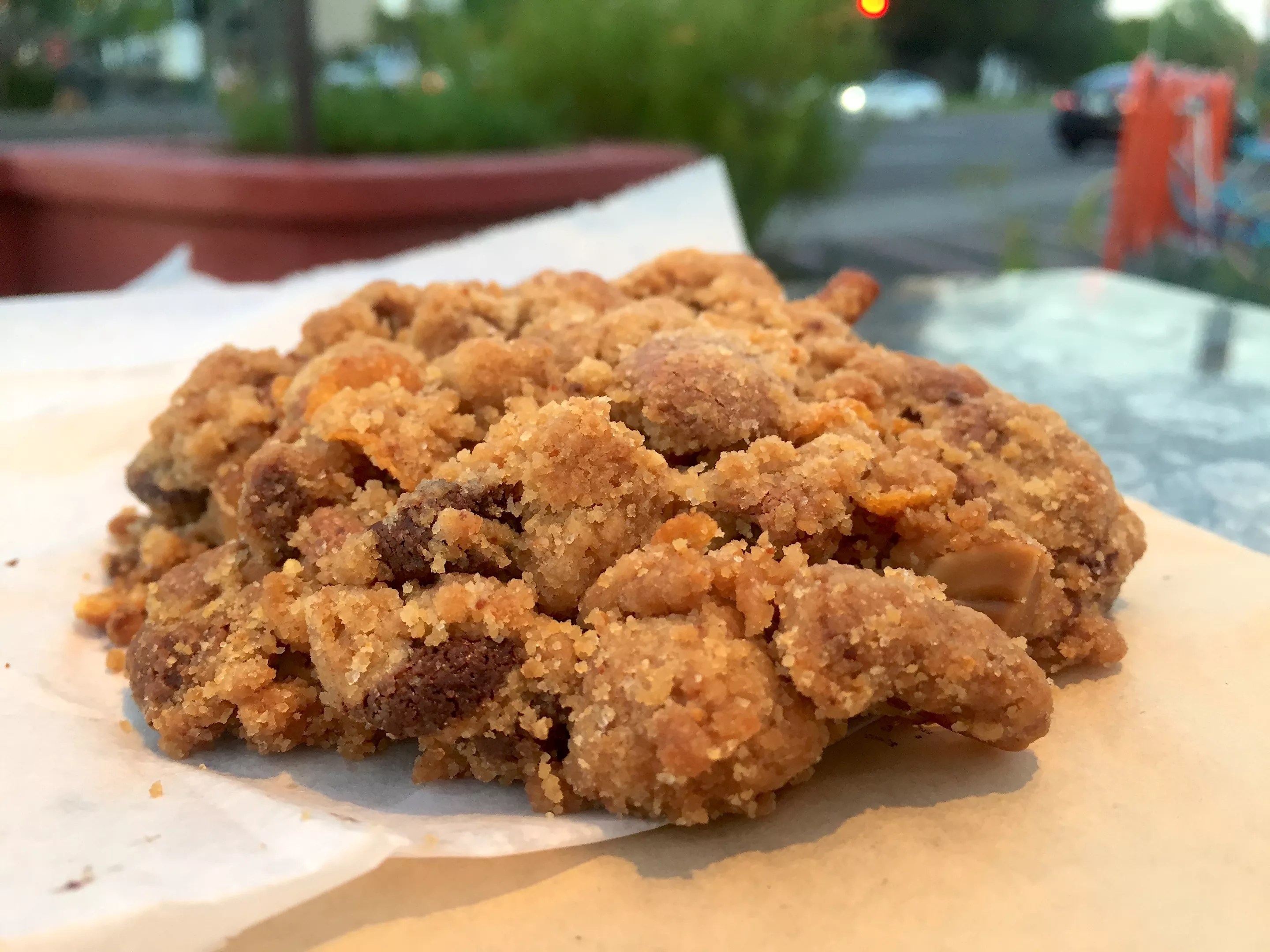 We’re pretty sure Cookie Monster would give a furry blue thumbs-up to this monster-sized cookie from Be Coffee. The biggest cookie on the list, the Cookie Monster has dough that is dense and delicious and on the sweeter side – no chewy middle here. But the real pièce de résistance are the peanut butter M&Ms that add a savory punch and crunch to each chomp. Me loves this cookie, and me loves the arthouse vibe only a coffee shop on RoRo could deliver.