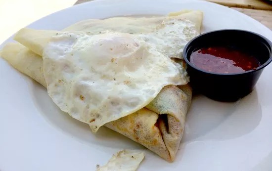 Merci French Cafe offers a savory ham and cheese crepe topped with an egg.