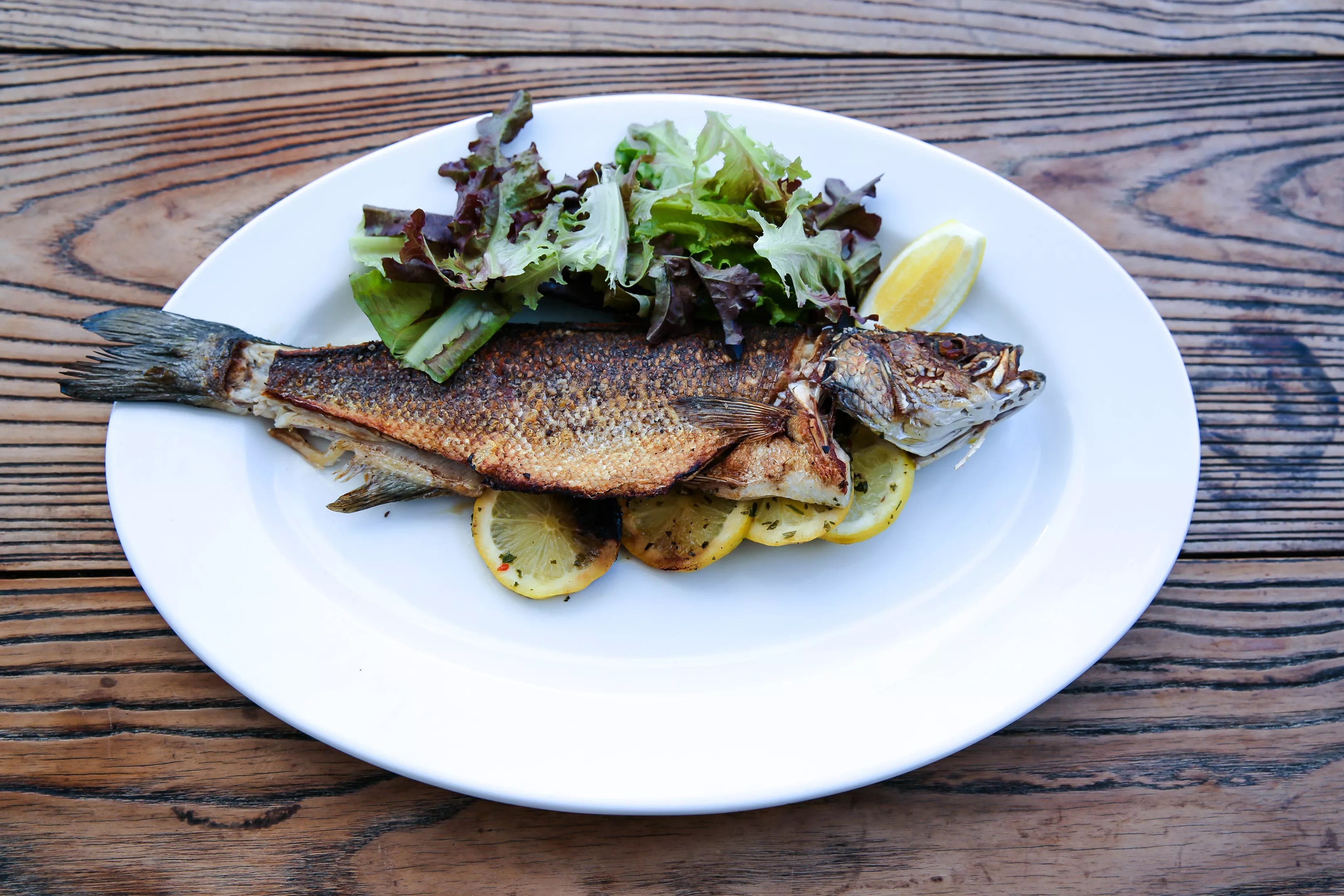 A grilled whole Branzino fish served at Zinqu