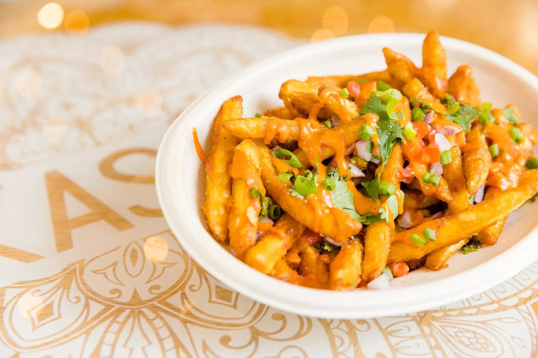 4747 E. Bell Road With a warning on the menu not to order for risk of addiction, the Loaded Gyro Fries at Saba’s get the party started. The fries are tossed with Greek seasoning and loaded with gyro meat and feta for $16. A spicy option with buffalo sauce is another possibility. For those who don’t eat meat, the Greek fries with lemon, oregano and feta cheese are a great vegetarian alternative ($8). Loaded fries get a twist with Indian flavors at Tikka Shack. Tikka Shack
