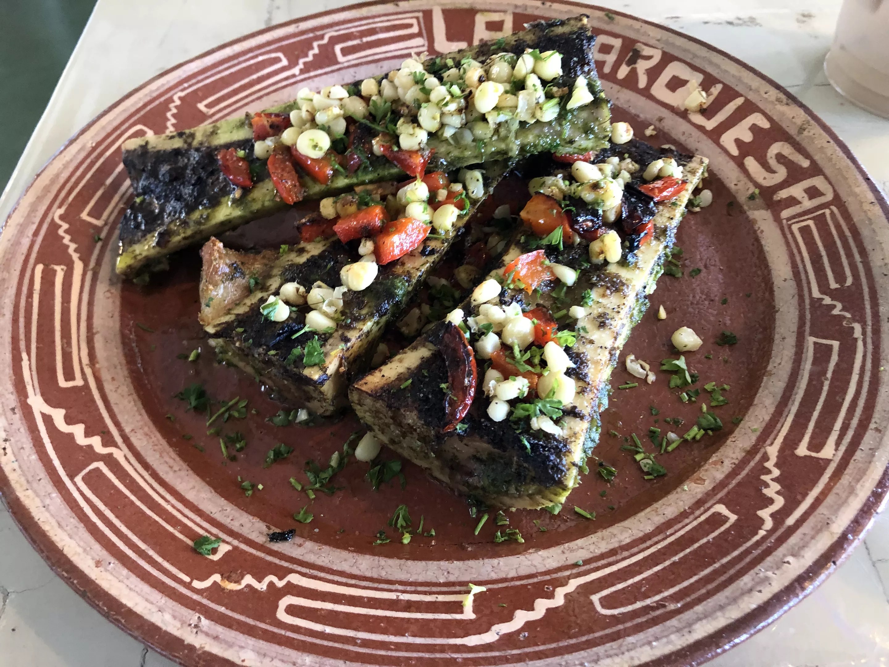 Gallo Blanco Marrow bones covered with esquites, red pepper, and parsley at La Marquesa. Chris Malloy