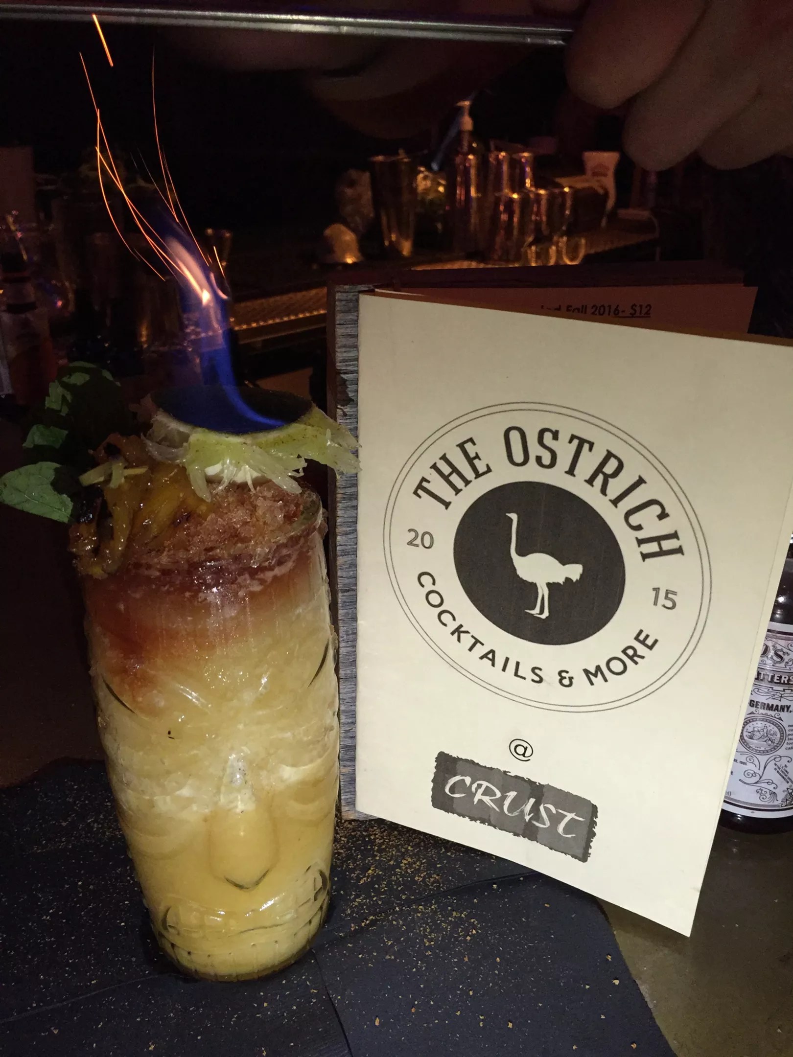 The Ostrich is an underground bar beneath Crust in downtown Chandler. Its Ostrich Signature Colada combines Ed Hamilton’s Jamaican Pot Still Rum and Plantation Stiggins Pineapple Rum with house-made charred pineapple syrup, cream of coconut, fresh pineapple juice, and Angostura bitters. The whole thing is garnished with a flaming, hollowed-out lime and shaved cinnamon.