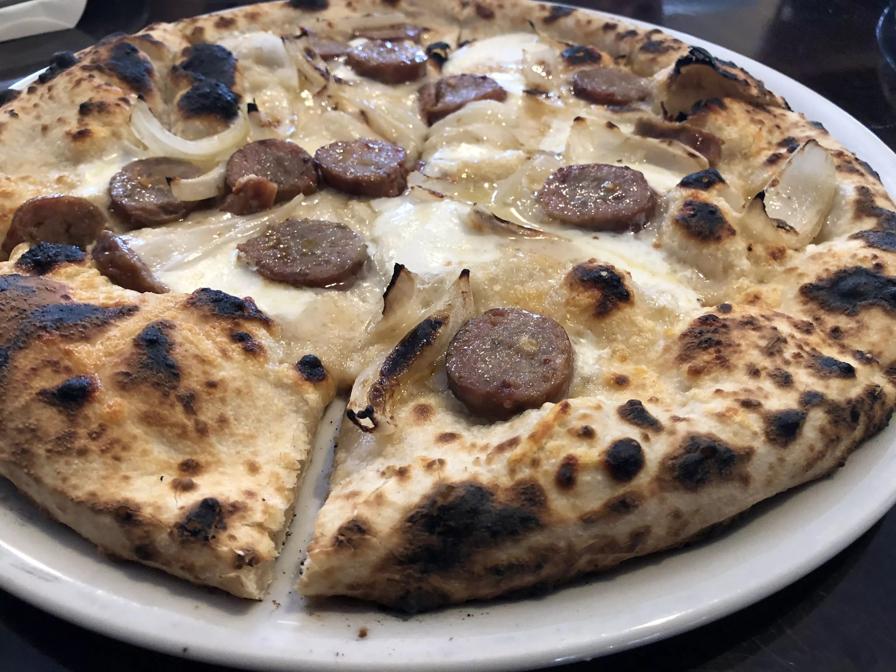 Matt Pilato, head pizzaiolo at Lamp, uses long fermentations that last from 25 to 56 hours. The result is a strong dough and, after a trip to the 1,000-degree wood-fired oven, crust with intricate flavor and structure. Pilato uses four kinds of cheeses on this pizza: mozzarella, ricotta, Pecorino Romano, and Parmesan. Your typical pizza casts toppings in a supporting role, and Pilato’s studied use of four cheeses says, in calculated white gobs and shreds, that this isn’t the case here. Other toppings on the Rapini co-star with the crust and cheese. Their flavors and textures meld with the four cheeses and signature crust the way a great pasta’s ingredients and sauce do with the hot noodles. Be sure to pull the trigger on the menu’s sausage option. Links are made with Sambuca and Chianti, and elevate the pizza to a happy place.