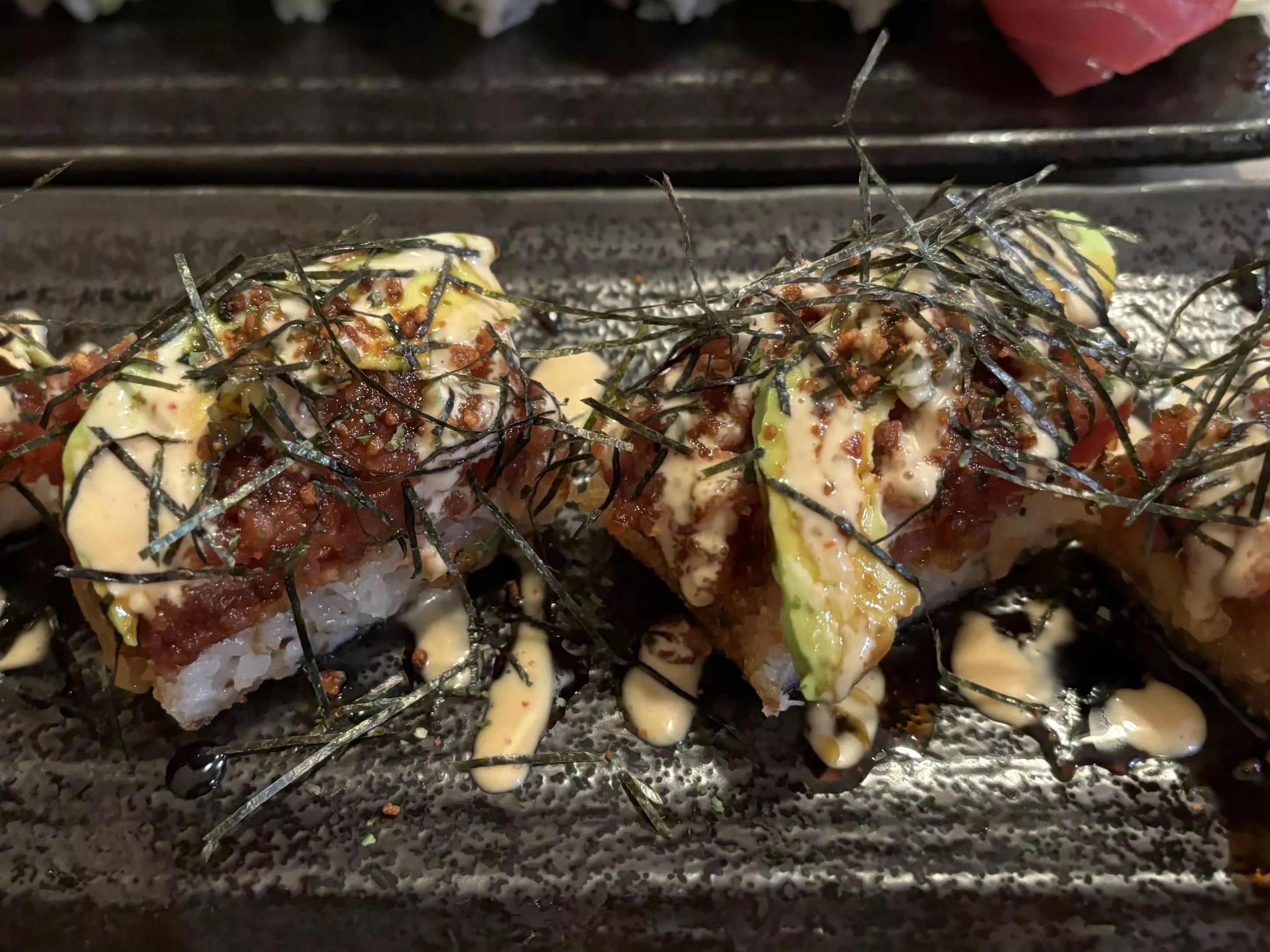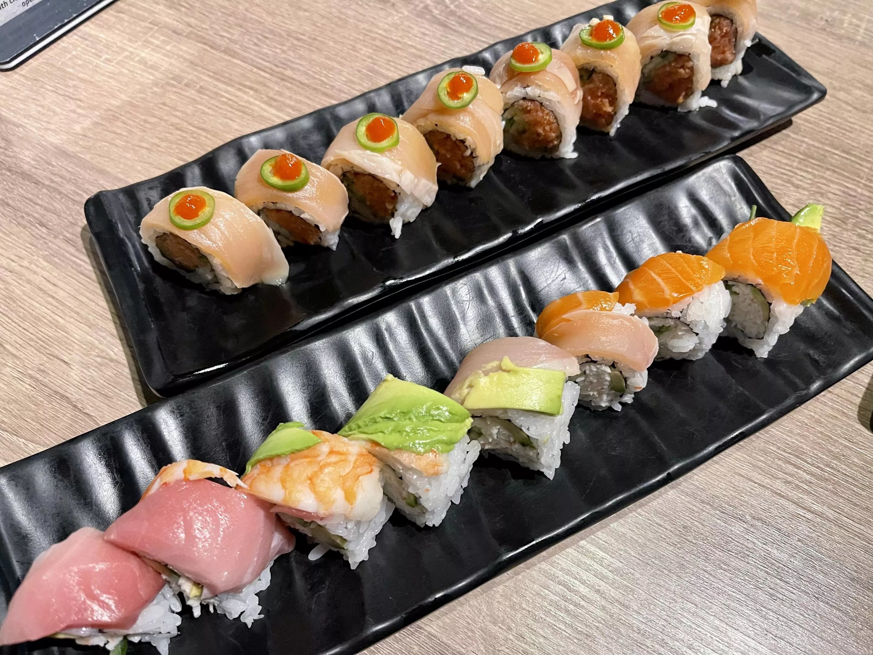 Tucked in a strip mall off Central Avenue between a cell phone repair shop and a Domino’s Pizza, sits King Salmon Sushi. The small, casual restaurant blends diner vibes with Japanese paintings, old signs and lanterns. And the menu offers a wide variety of dishes spanning different cuisines. Try a Korean rice bowl with beef bulgogi, a Japanese donburi bowl, some udon noodles or poke. But we’re here for the sushi. The large menu offers basic rolls, hand rolls, vegetarian rolls and special rolls. We’re partial to the Lion King, a baked roll served in an aluminum foil boat and topped with a mountain of fresh salmon, and the Pacific roll. More fish than rice, this roll is jam-packed with slices of hamachi, salmon, tuna and white fish in every bite. Even better? The restaurant is running an ongoing special, offering all sushi rolls for 50% off. These rolls are great quality for the full price. For half off, they’re a steal. King Salmon also opened a second location this fall in Arcadia.