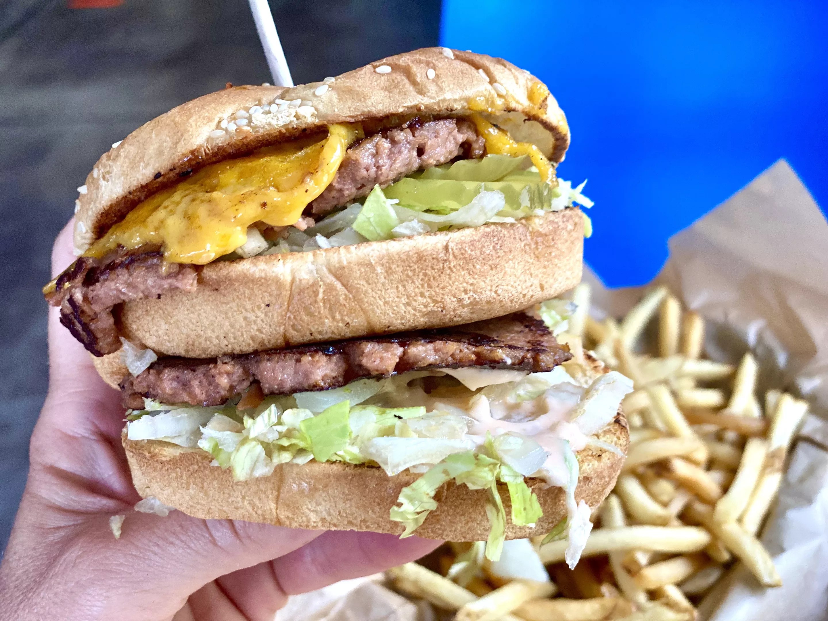 A total look-alike to the Golden Arches’ double-decker, this one comes with two hand-packed, plant-based patties made with a combo of Beyond Meat and textured soy protein. They so closely mimic McDonald’s, if you close your eyes, you wouldn’t know the difference.