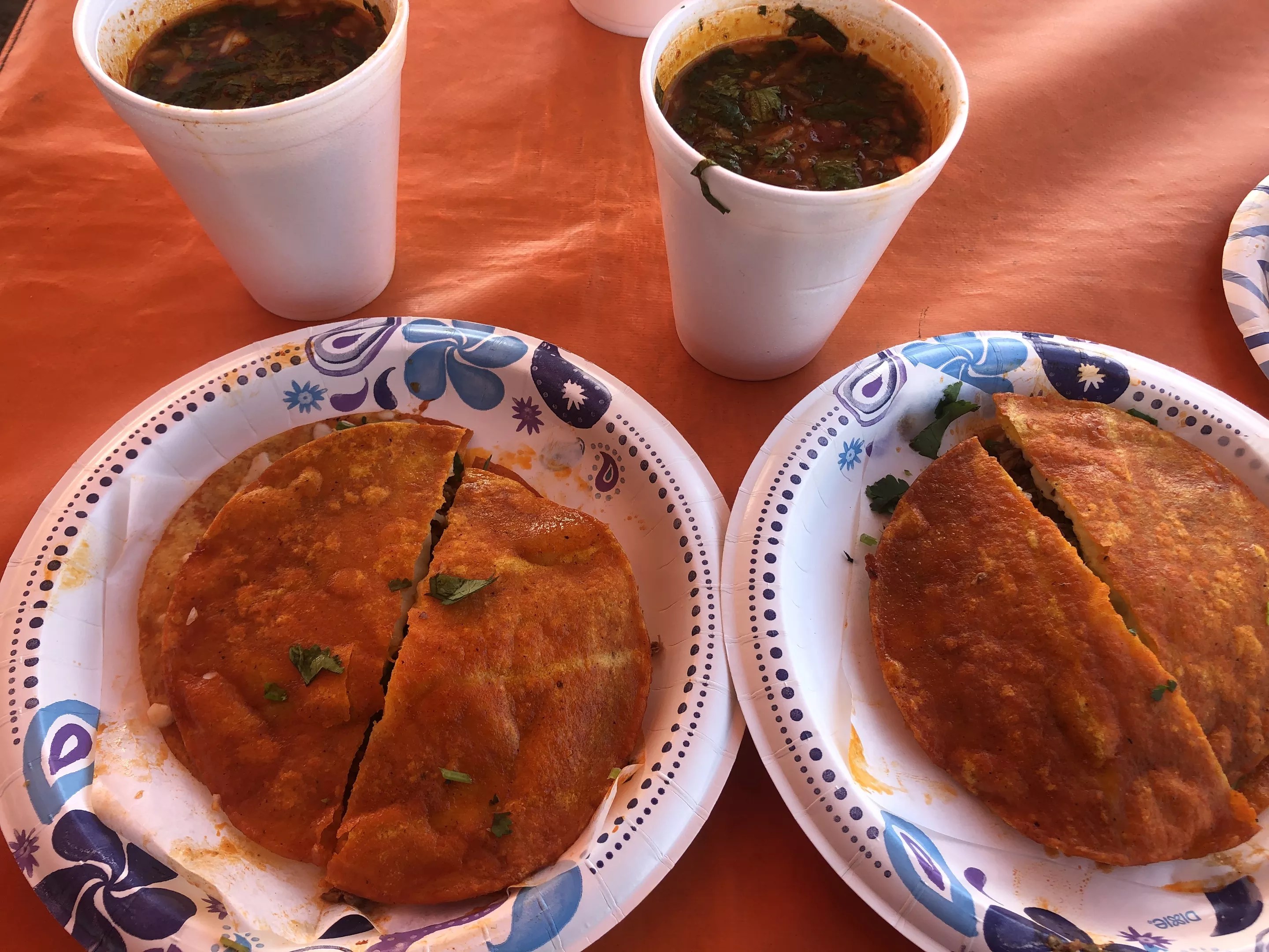 Food comes fast. On that recent day with cars swishing by just a few yards away, my lunch came in three or four minutes. Two orders of quesabirria. One quesataco. Not to mention an agua fresca that carried the fruity flavor of overripe pineapple, poured with ice into my wide Styrofoam lid.