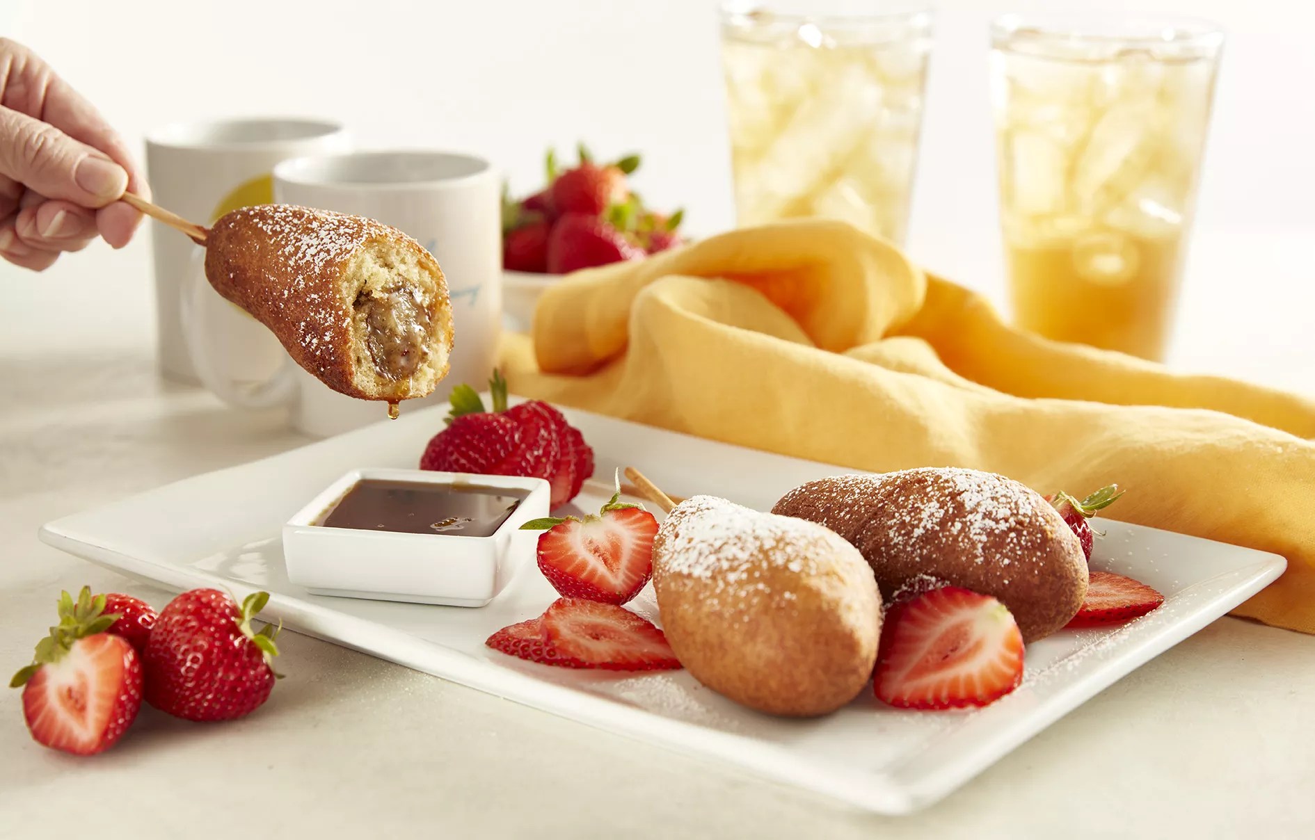 Over Easy brunch favorites like waffle dogs are covered with a holiday gift card.
