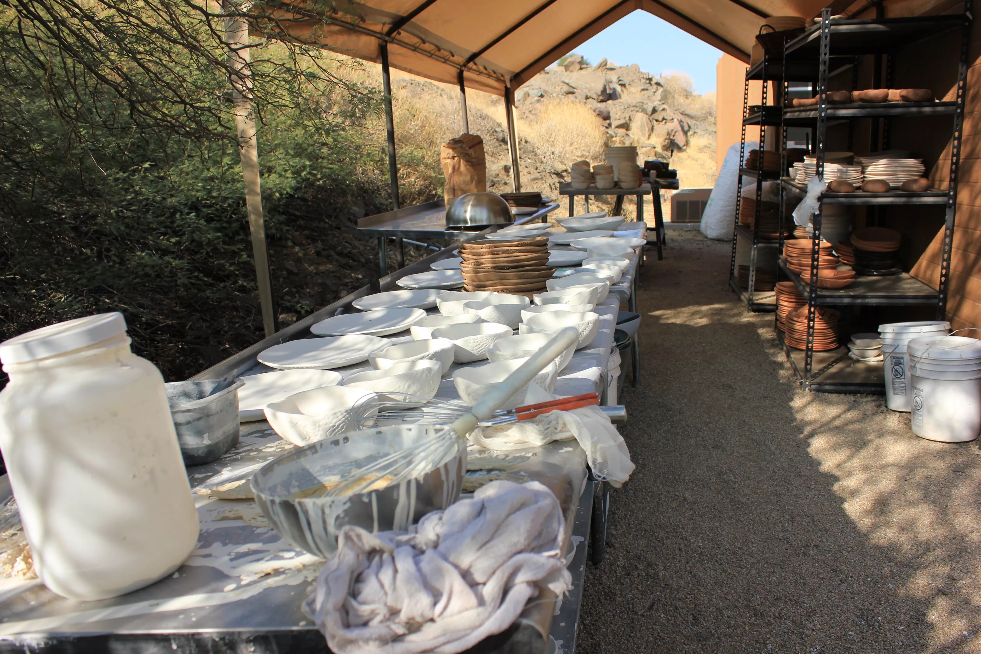 Hundreds of clay vessels litter her studio in various states of doneness. There’s raw clay, brown, that she has just rolled out. A row of newly shaped bowls is covered by a tarp. There are finished dinner sets of three pieces each, each unique, each meant to help kindle the vision of the next chef come in to collaborate with her on a custom design. Some ceramics stand bone-white from being bisque-fired, the glaze yet to be applied. Some are baking at 2,200 degrees in the electric kiln.