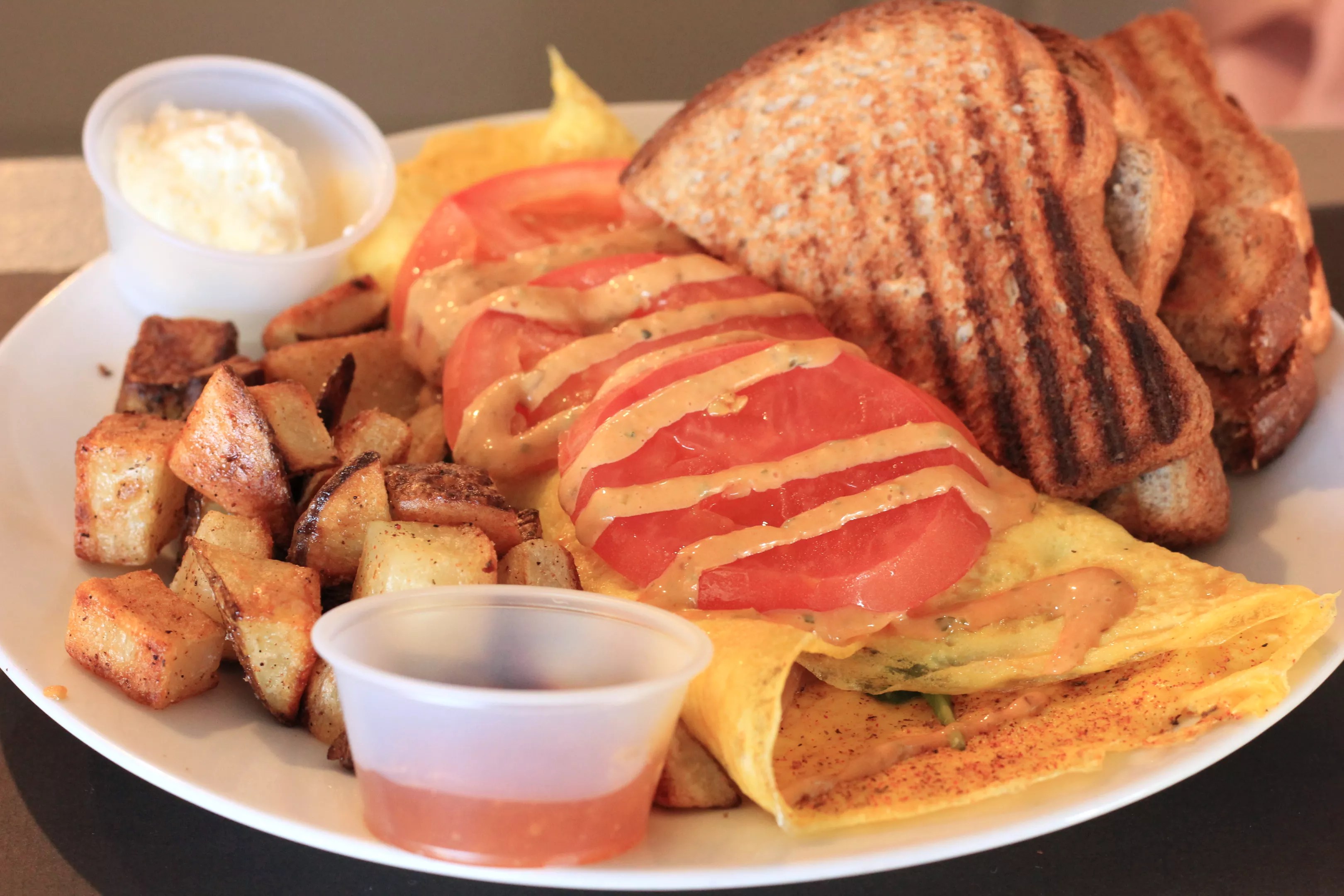 More surprising is Sugar Jam’s savory selection. A croissant split in half and loaded with scrambled eggs and bacon makes a hearty morning meal. Leaf-thin omelets have way more finesse than you’d expect. The veggie omelet contains peppers, onion, spinach, and Monterey Jack. Tomato slices on top are laced with a nice smoky chipotle remoulade, which provides an on-key accompaniment, also, to the side of crisped potatoes.