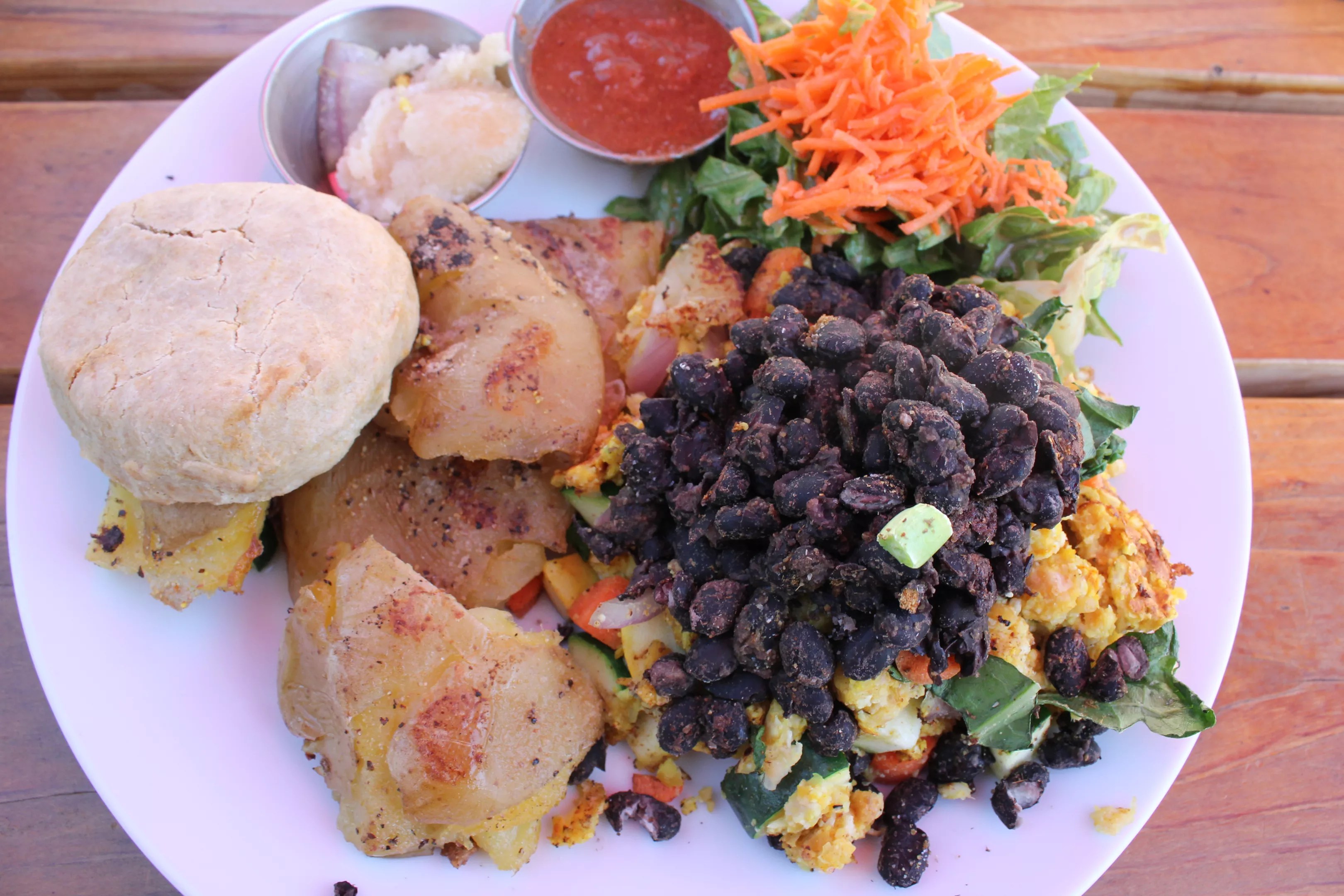 You can order breakfast sandwiches with tempeh instead of meat, black bean burgers, or a quinoa breakfast bowl. A buckwheat crepe comes with a litany of fillings including hummus, cauliflower, various vegetables and nuts, and dates from Agritopia.