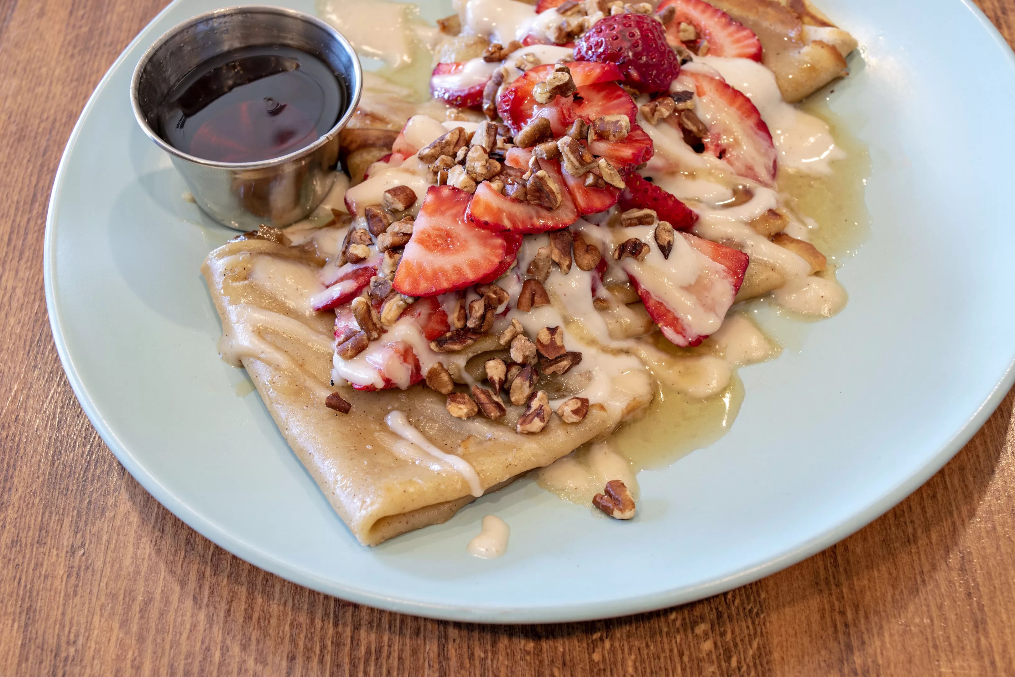 French-style crepes, another breakfast option, look similarly appetizing. Perez dials up this “Napoleon meets conquistador” concept of soft, overlapping chevrons with a shower of cut strawberries and broken pecans. Tres leches crema that emulates the milk-sopping cake dampens the top, bringing faint notes of caramel, cinnamon, and vanilla. This small-but-mighty plate brings something new and Southwestern, yet all the warm comfort you want when ordering crepes in the first place.