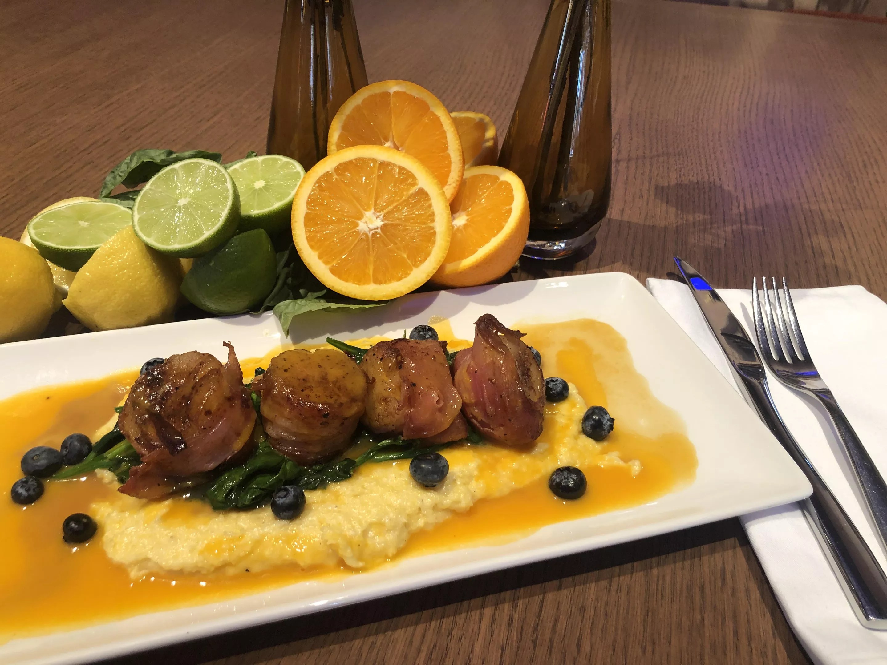 Pan-seared scallops on a bed of Ramona Farms polenta with nectarine butter sauce is one of Carcara’s entree choices.