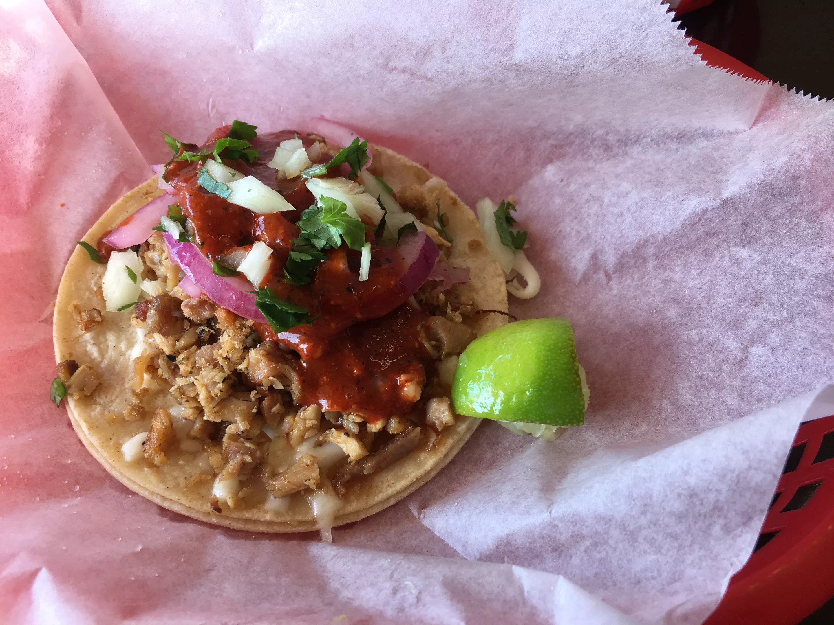 If it’s your first time in, the staff may offer you a complimentary Kiss signature taco. Two small, soft corn tortillas come loaded with chopped chicken and a little pork.