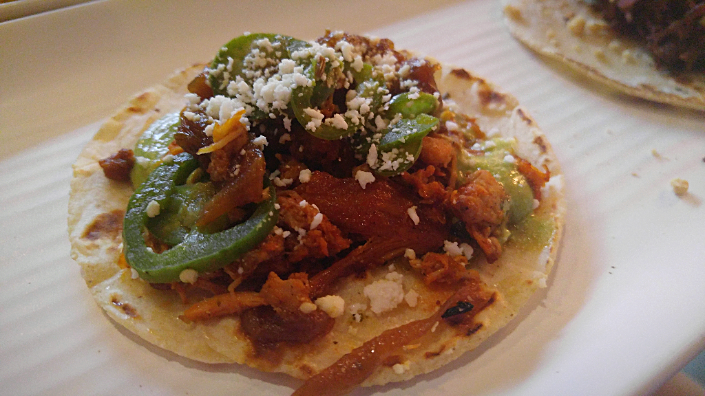 You’ll find popular tacos like al pastor and carne asada, along with varieties like duck carnitas, pollo tinga, short rib, and chorizo y papas. I tried the al pastor and pollo tinga, of which neither really left much of a memorable impression. The flavor on the chicken tinga was a little flat; the al pastor had good flavor, but not the sweet, slightly charred appeal you really want from al pastor. Maybe it’s the tiny portions – two bites and your taco is history – but these tacos don’t seem poised to replace any of your local favorites.