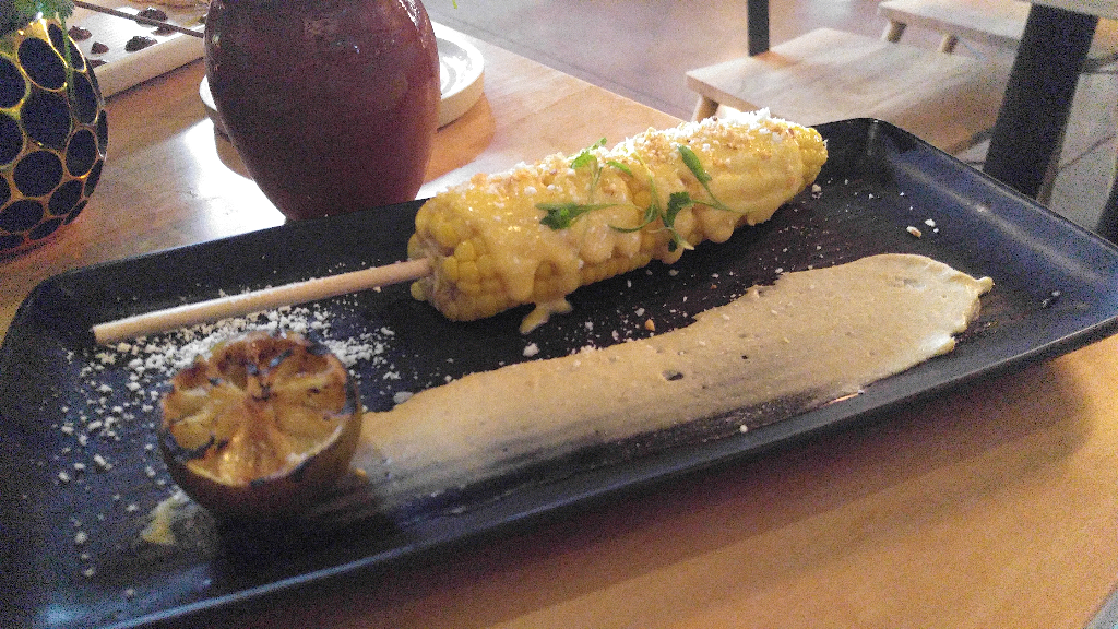 The elote appetizer at Chico Malo features corn that has been poached in corn nut broth and drizzled with thick, movie-style butter.