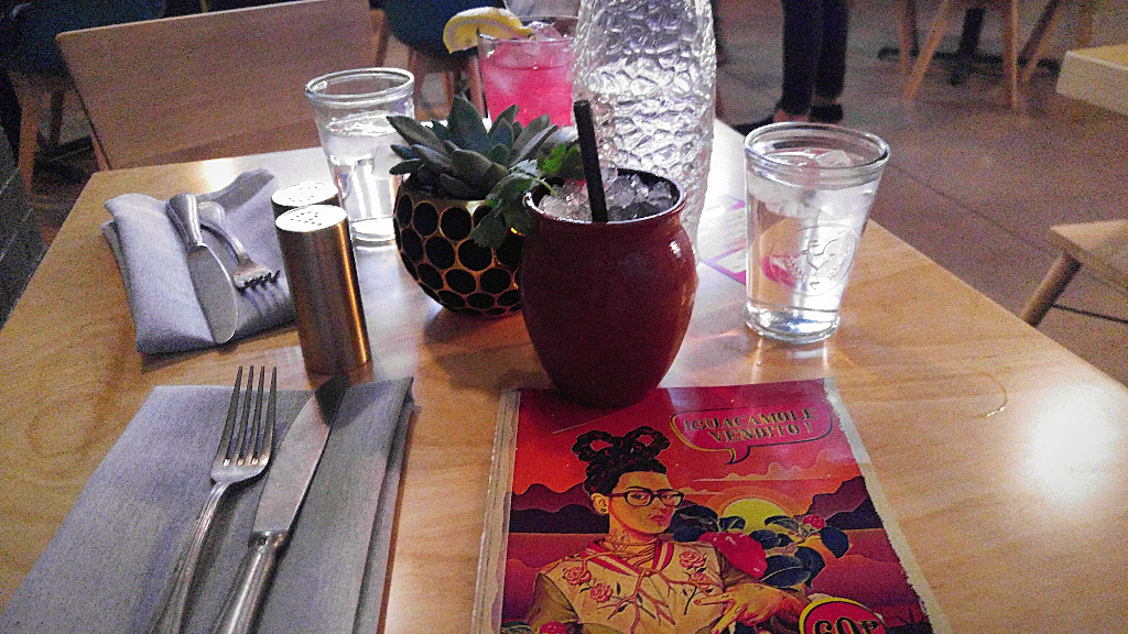 The restaurant also boasts a very stylish lobby area, featuring a lavish, bold mural that playfully collects some of the trendiest and most recognizable motifs of Mexican culture and art onto a single wall. It notably features a hipster Frida flashing signs, a masked luchador, and a duo of singing calavera skeletons.