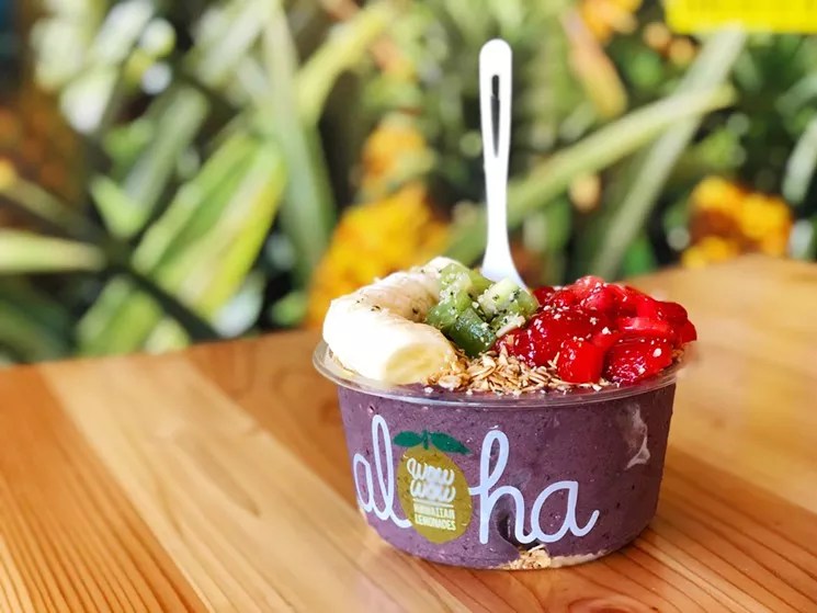 Wow Wow Hawaiian Lemonade – now open in Scottsdale and coming soon to Ahwatukee, Glendale, and Gilbert – offers roughly 35 different flavors of raw, cold-pressed lemonades and limeades. There are the standards, such as classic all-lemon, strawberry mint, and watermelon basil. Each can be ordered iced or frozen. Then there are sparkling varieties, including the crisp and sugary mojito limeade, made with coconut water and sweetened with agave or local honey. Lastly, there are “life” lemonades, which seem to offer health benefits with additions like cayenne, turmeric, and charcoal. Iced teas, cold brew coffee, and rotating kombuchas on tap are also available. The shop itself has an easygoing island vibe, complete with surf videos on loop, a dog-friendly patio, and leafy plants nestled all over. It’s an ideal place to chill and binge on healthy-ish treats with friends or family.