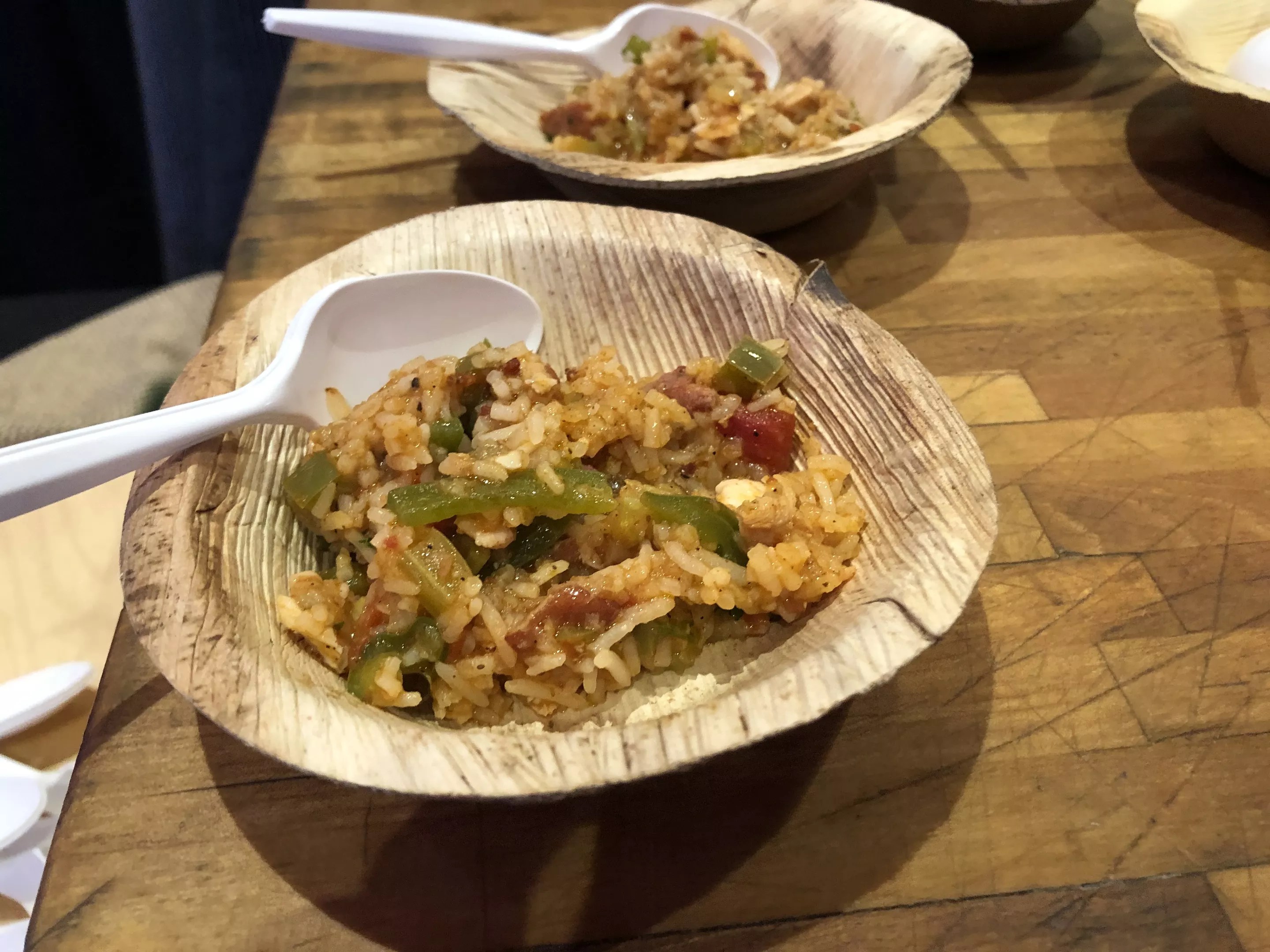 Sometimes, a classic is needed. In this case, The Parlor took the classic plate of chicken in lemon juice, capers, and white wine and jumbled its equation by introducing a giant pillow of herb-flecked ravioli. This soft ravioli’s velvety sauce called to mind the floods of Saturday. The single raviolo on each lipped plate was just swimming. After one bite, the creamy sauce rushed in through the tear to soak the pasta’s filling. I bet some people skipped The Parlor’s stand, given the simplicity of its three-ingredient sign, “Chicken Piccata Ravioli,” relative to other stands’ ornate descriptions. Big mistake. Closeup of a damn good jambalaya from Justin Beckett. Chris Malloy