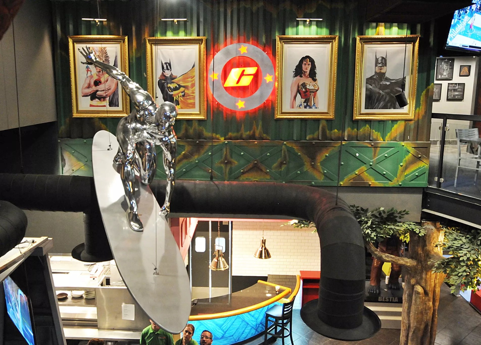With the slogan, “This is where your favorite superheroes unite,” Comic X offers monuments to pop culture and geek-friendly subject matter abound inside the 8,000-square-foot theme restaurant, which offers seating for 200 people. The menu is loaded with nachos, brisket fries, salads, and burgers under names like Atlantis Coconut Shrimp, Lord of the Onion Rings, and the Supersonic Cheeseburger. Gluten-free and vegetarian options are available too.