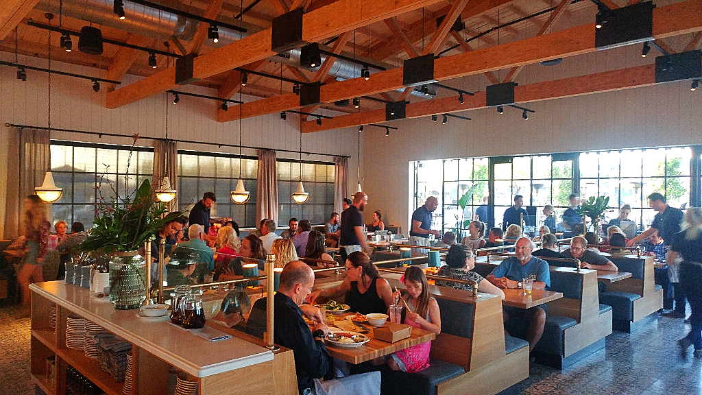 The dining room at Doughbird is modern and lively, with a beachy, Northern California-inspired design.