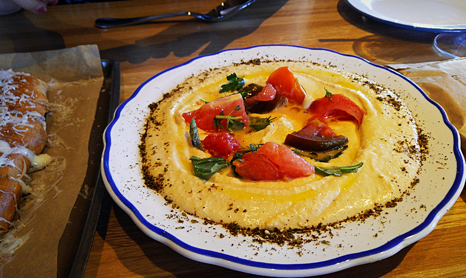 My server also recommended the house-made hummus, another well-crafted starter accented with spices, fresh herbs, and tomatoes, and a fine swirl of good-quality olive oil. It’s very creamy and fresh, and comes with a small hearth loaf, presented in a paper wrapper to preserve its warmth.