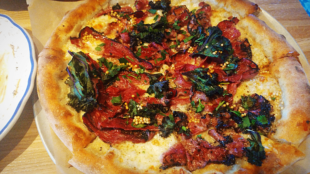 I ordered the crispy pastrami, a white pizza that features a crust rubbed with rye salt, to help evoke the flavors of a classic pastrami sandwich. It’s a clever and inventive pizza, a salty-rich fusion of flavors and texture that revolves around long strips of crisped-up pastrami. It’s topped with wispy, oven-roasted leaves of purple kale, which are not intrusive at all, but add a nice pronounced crunch to every slice. A dash of aromatic pickled mustard seeds meld beautifully with the pastrami and the pie’s garlicky base of aged Gruyere. The crust is wonderfully chewy, too.