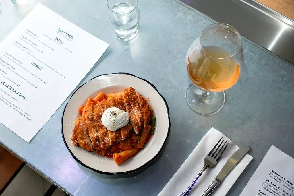 Low-intervention, unfiltered wines permeate the wine list selections, and the cocktail menu mirrors the sweet, sassy and somewhat unhinged meme-posts that Saint Pasta has built a cult following around. Bartenders Ryan Tardif and Richie Sullivan are having fun complementing the entrees and pastas with some zany, delicious drinks.