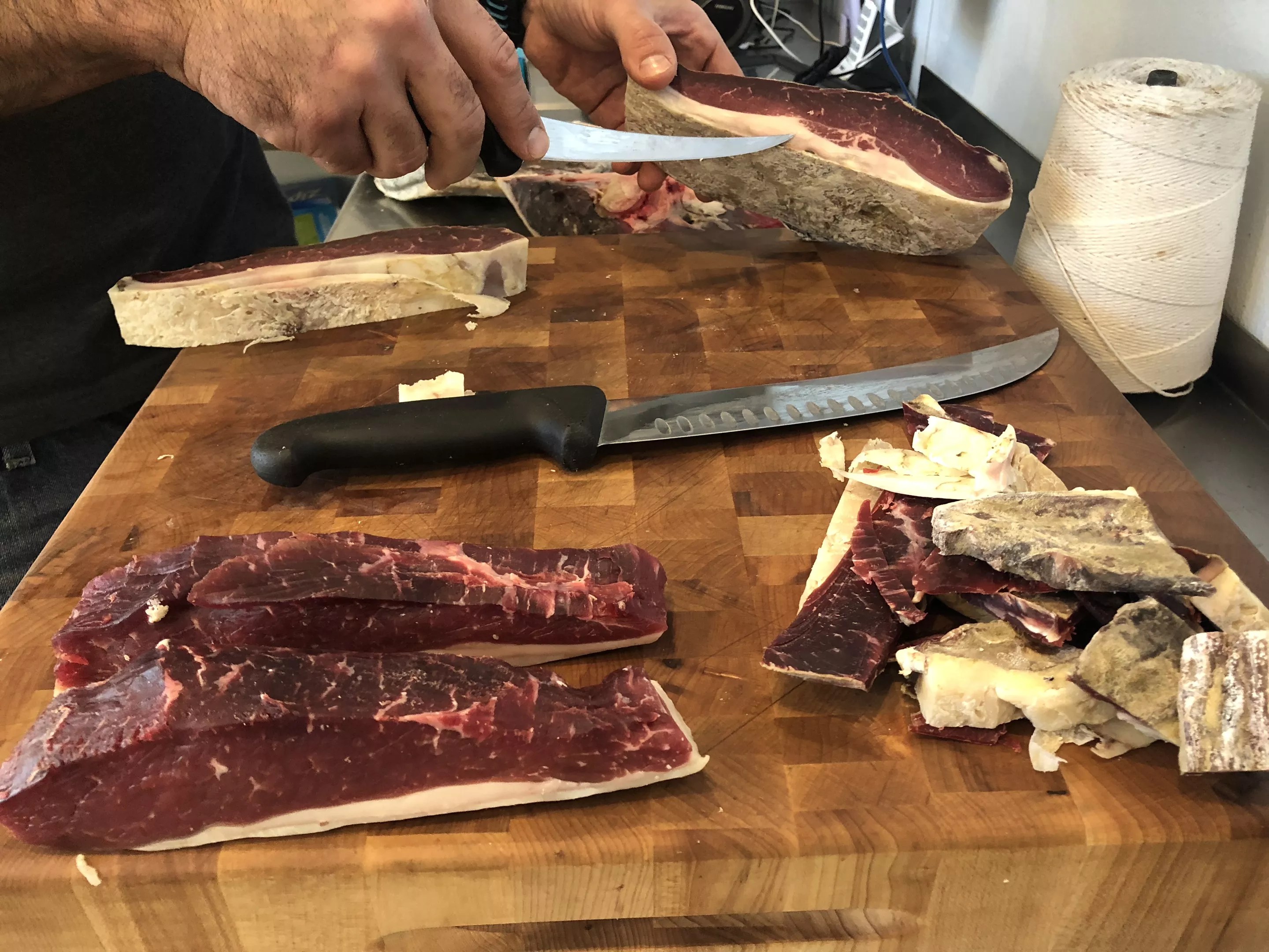 “This thing is going to be melting,” says Nick Addante, as he trims New York strip aged for 100 days.