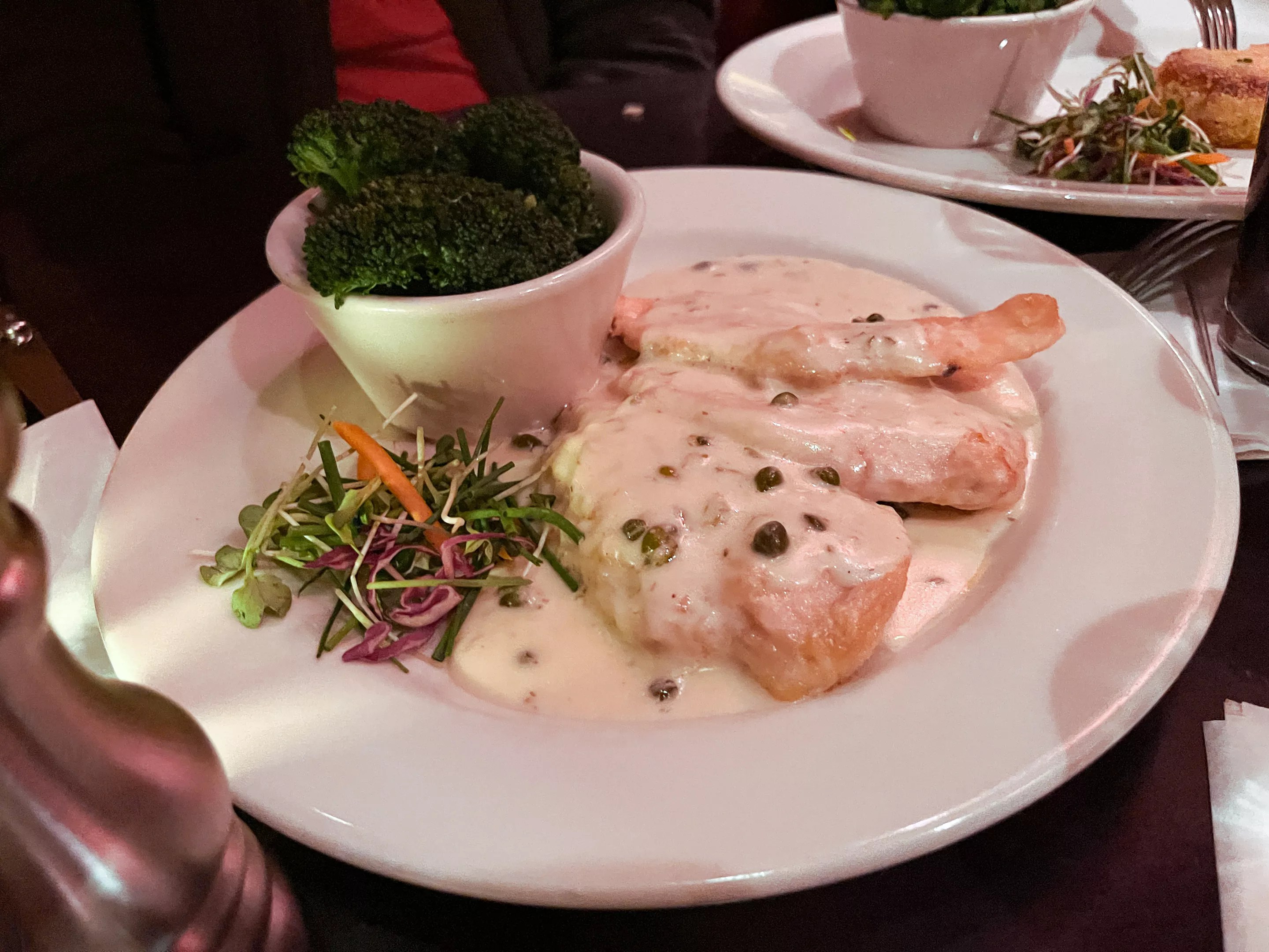 I know we like to use the word “tasteless” in a colloquial, pejorative sense. But in this instance, I mean it in the most literal way possible. This spongy, saucy chicken breast has no flavor. There is nothing there. Even the capers taste like nothing. How does one strip the flavor from a caper? One of my tablemates takes a bite, pauses, glances up nervously and says, “Do I have COVID?”